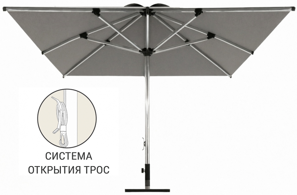 С системой веревочный полиспаст зонт открывается, потянув за веревку на корпусе зонта. После того, как веревка натянута, и купол полностью открыт, зонт фиксируется путем наматывания веревки на крючок на корпусе зонта.