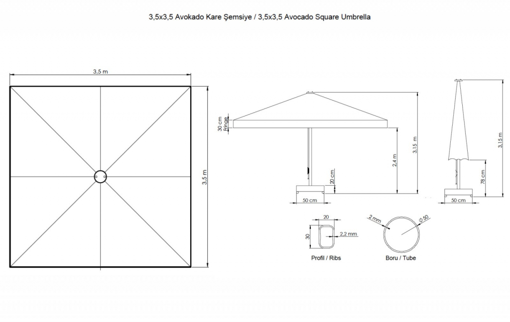 - Алюминиевая центральная опора Ø70 мм и толщиной стенки 3 мм. Алюминий окрашен и прошел специальную термообработку, которая повышает прочность и коррозионную стойкость зонта.