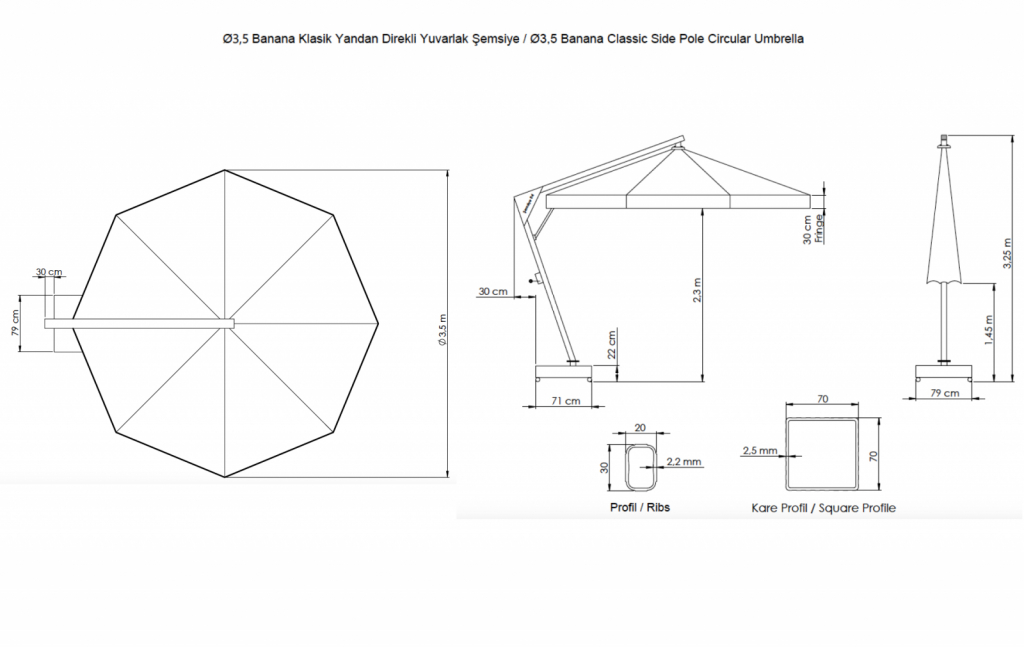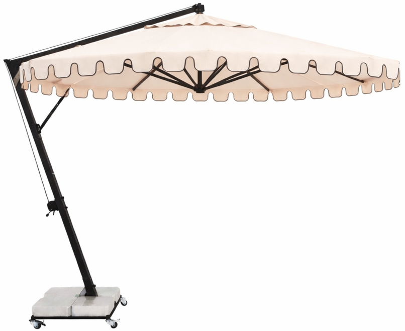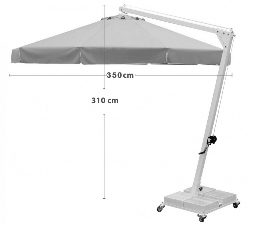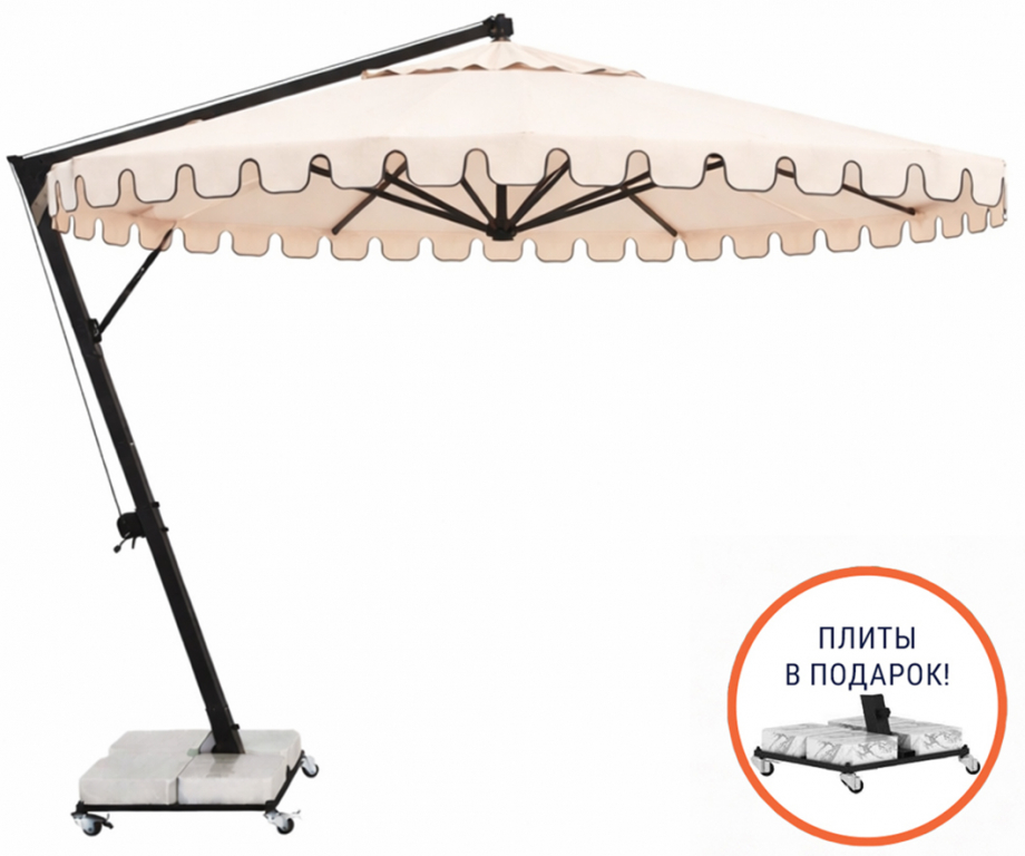 Banana - профессиональный зонт с боковой опорой из алюминия, что обеспечивает его высокую устойчивость. Он защитит от ярких солнечных лучей и создаст приятную затененную атмосферу в частных садах, открытых летних площадках кафе, баров и ресторанов, зоны возле бассейна. Наличие боковой опоры зонта гарантирует, что тень зонта используется более эффективно, чем с зонтами с центральной стойкой. Хотя это корпоративный продукт, предпочитаемый кафе, ресторанами и отелями, однако, зонт Banana также украшает многие сады и террасы. Это очень востребованная модель по таким причинам, как практичность и эргономика, возможность открывать и закрывать, не мешая тем, кто находится под зонтом, а также простота транспортировки и перемещения благодаря утяжелительной базе с колесным тормозом. Особенности: Боковая опора сечением 70х70 мм и толщиной стенки 2.5 мм выполнена из окрашенного алюминия со специальной термообработкой, которая повышает прочность и коррозионную стойкость зонта. 8 алюминиевых спиц 20х30 мм и толщиной стенки 2 мм. Детали выполнены из цельного пластика. Высота до кромки открытого купола: 2200 мм. В комплект входит металлическая база на колесах, размер: 790х710х60 мм, с мраморными утяжелителями, размер: 340х340х120 мм. Вес базы 24 кг, каждый утяжелитель 34 кг. Общий вес базы 160 кг. Размер упаковки: 850х750х100 мм. Механизм открывания и закрывания зонта обеспечивается поворотом лебедки, соединенной с механической системой передач на боковой части корпуса. Эта механическая система передач также имеет предохранительный замок для повышения безопасности. Даже если кронштейн зонта находится в разблокированном состоянии, он не повернется назад, и зонт не закроется. Как только вы открываете этот замок, кронштейн зонта возвращается на один уровень, позволяя закрыть зонт. Благодаря этому механизму, не требующему дополнительной силы, зонт легко открывается и закрывается. Купол выполнен из акрила 2926 (natural) с черным кантом. Функция вращения на 360º оплачивается дополнительно. Обращаем Ваше внимание! Плиты идут в подарок к зонту! В норме допускаются незначительные сколы и царапины мрамора по периметру, т.к. мрамор - это природный материал. На плиты рекламации не принимаются, Вы имеете право безвозмездно отказаться от них. Открыть инструкцию поэксплуатации уличных зонтов. Цена на сайте указана за модель с каркасом черного цвета и куполом из акрила с воланом с кантом. Цены на другие модели Вы можете уточнить у менеджеров.