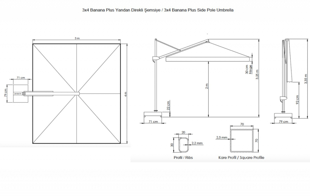 • Боковая опора сечением 70х70 мм и толщиной стенки 2.5 мм выполнена из окрашенного алюминия со специальной термообработкой, которая повышает прочность и коррозионную стойкость зонта. Высота опоры - 3100 мм.