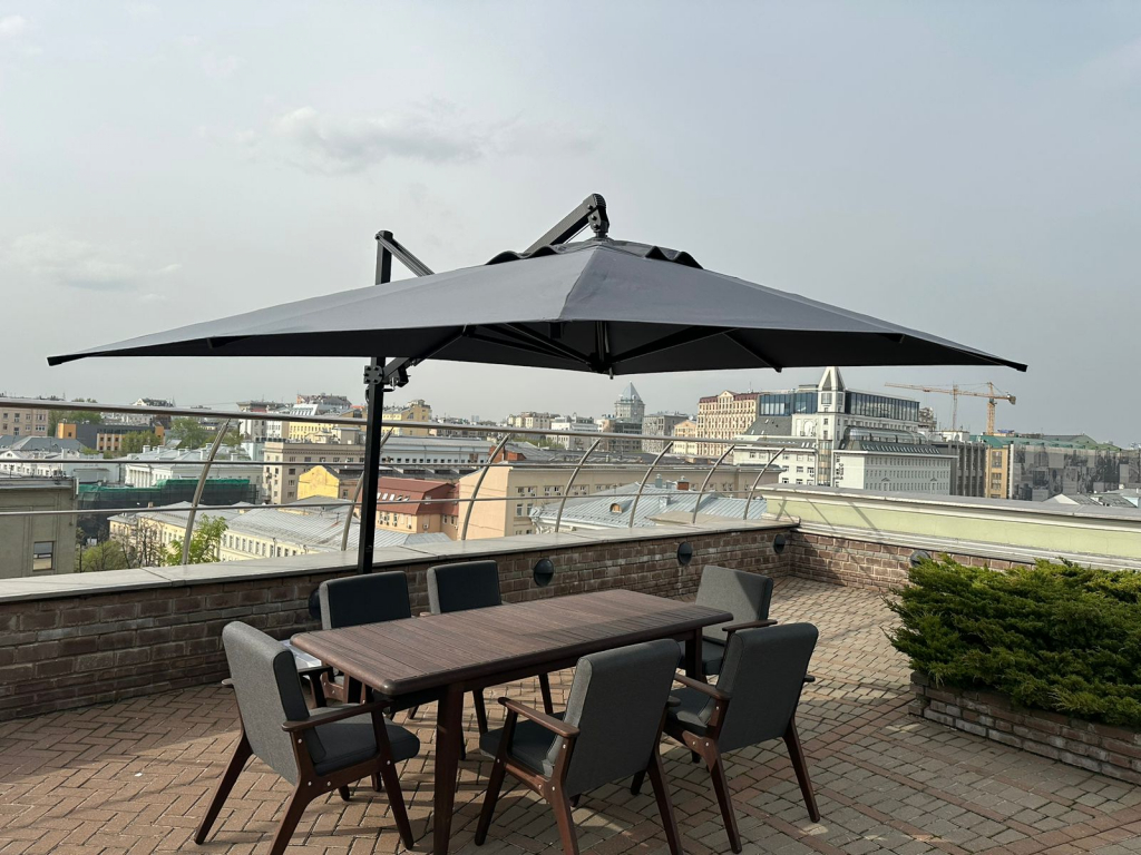- Боковая опора сечением 70х70 мм и толщиной стенки 2.5 мм выполнена из окрашенного алюминия со специальной термообработкой, которая повышает прочность и коррозионную стойкость зонта. Высота опоры - 3100 мм.