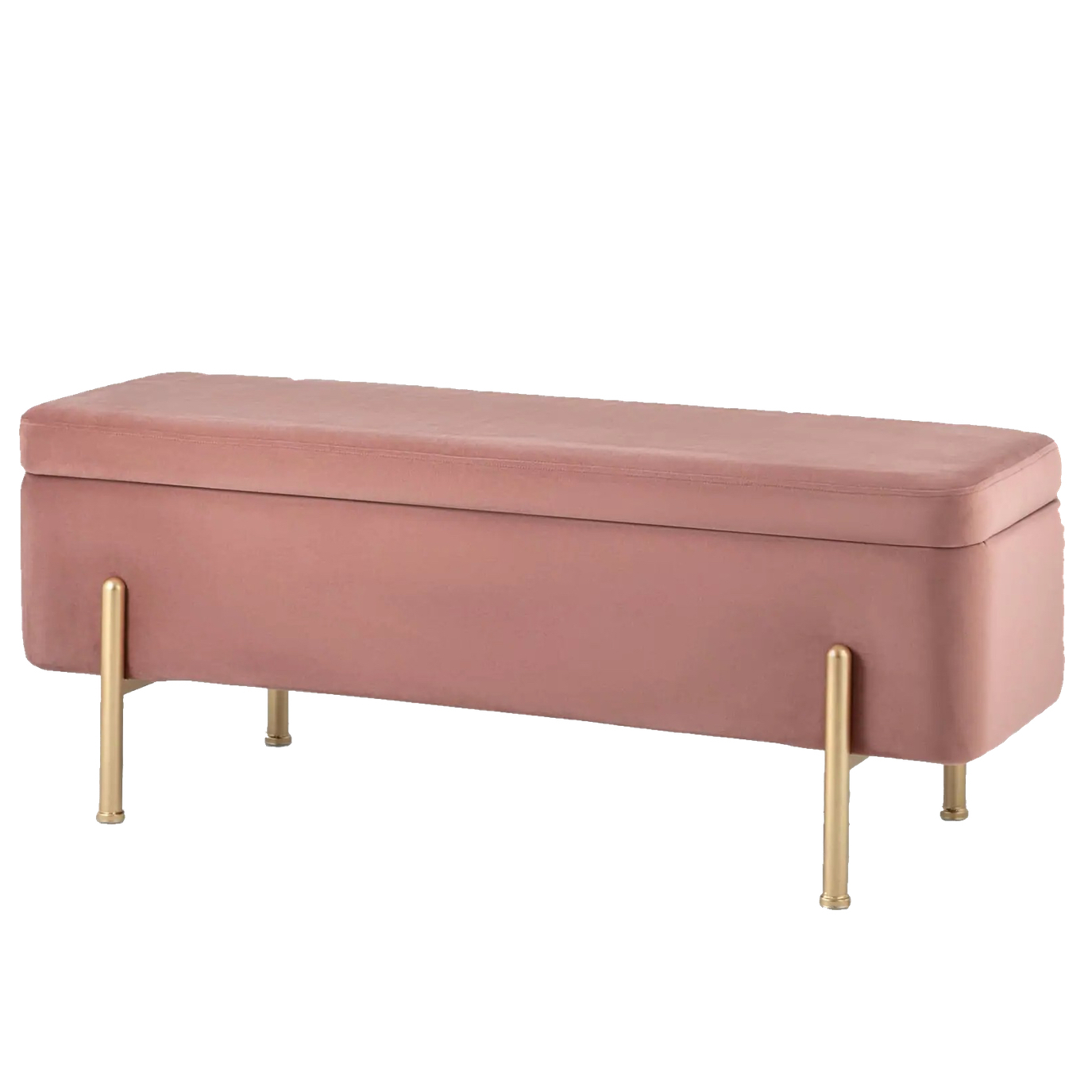 Стильная модель банкетки в обивке из мягкого велюра, прекрасно дополнит интерьер спальни или прихожей. Изящные ножки выполнены из металла в золотом цвете. Под сидением имеется ящик для хранения необходимых вещей. На ножках предусмотрены мягкие накладки, которые предотвращают повреждения напольного покрытия.