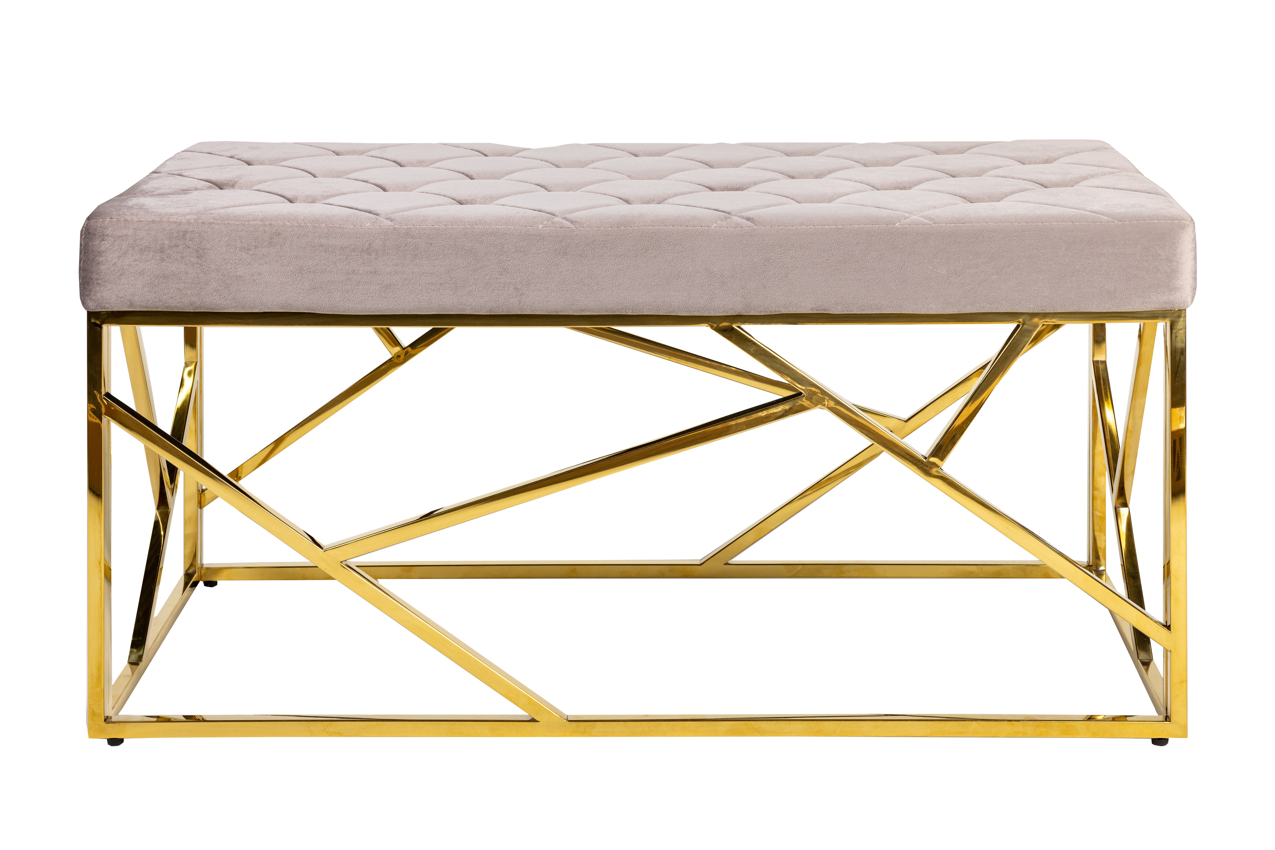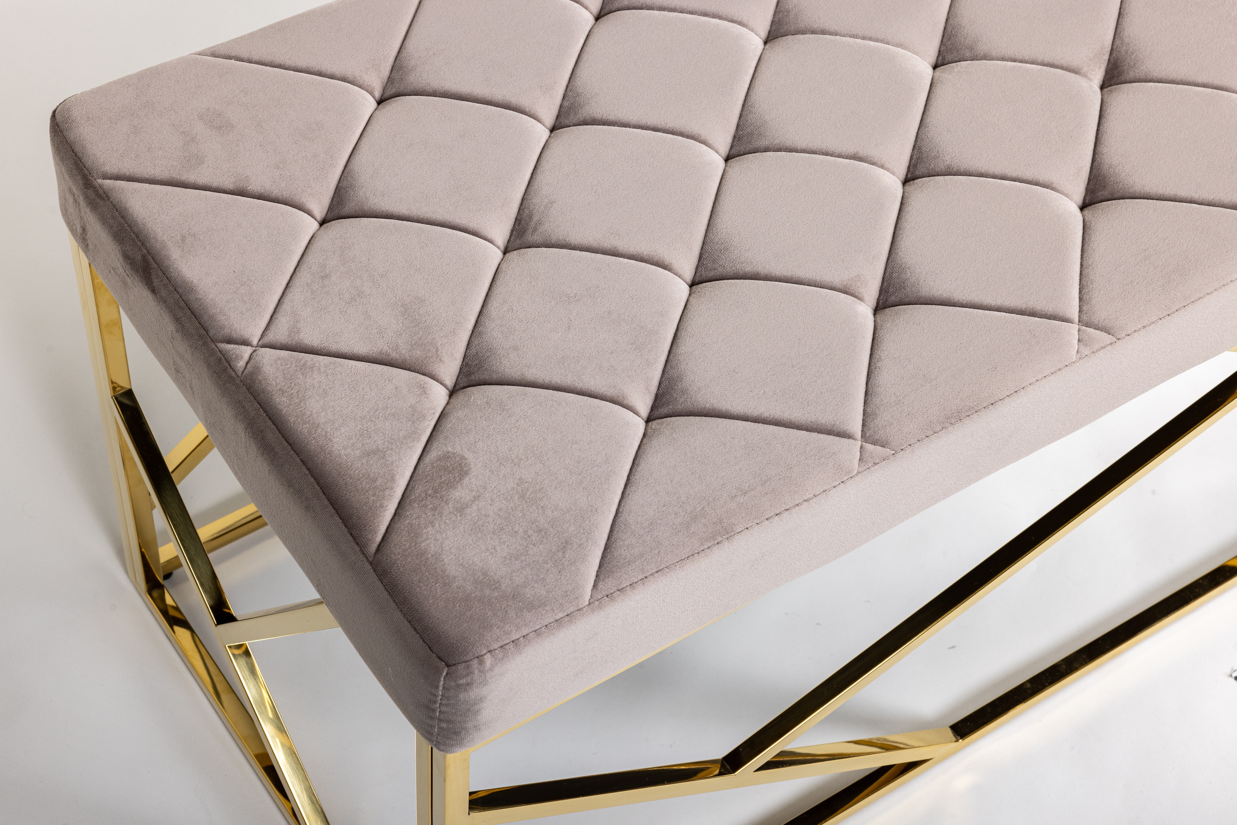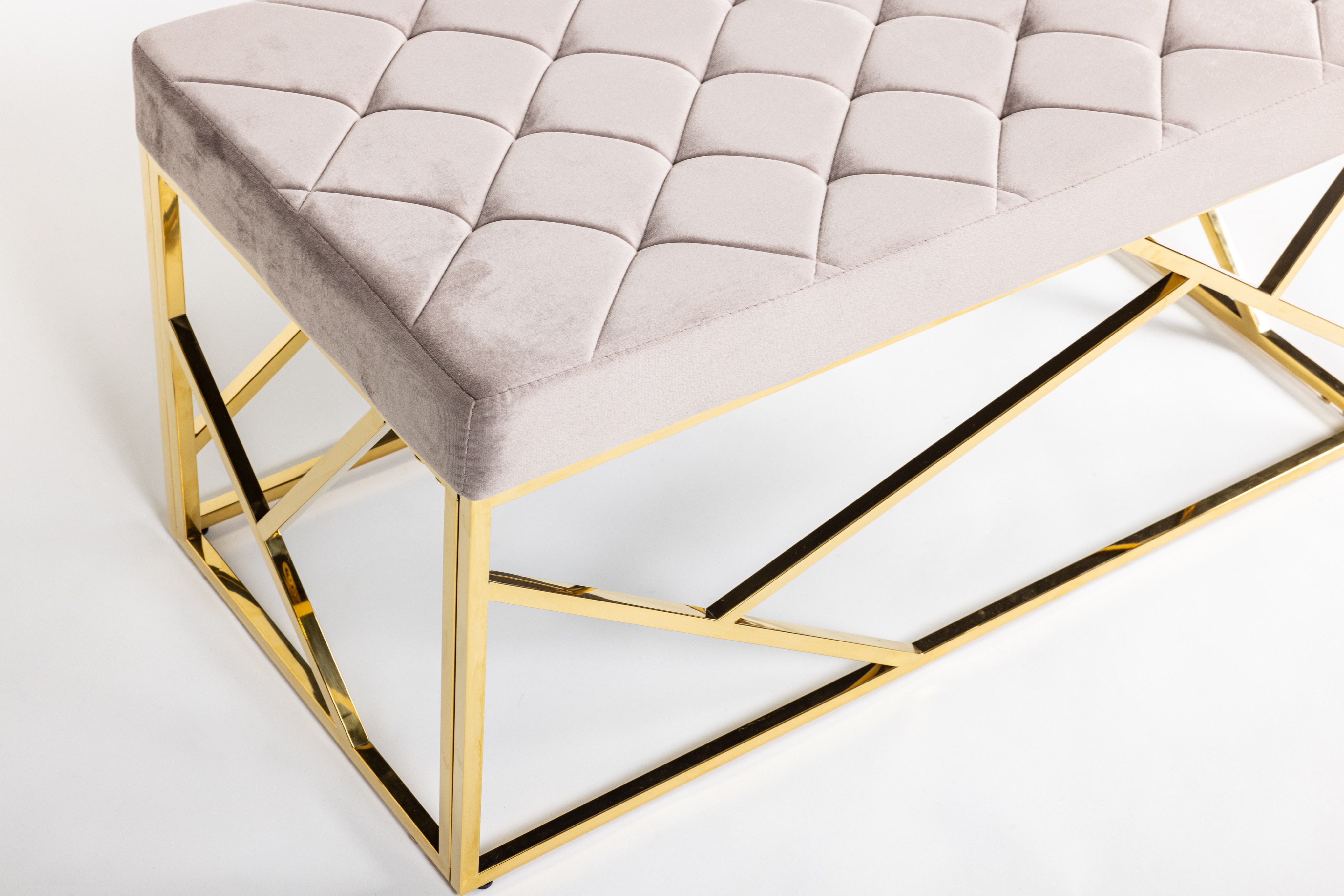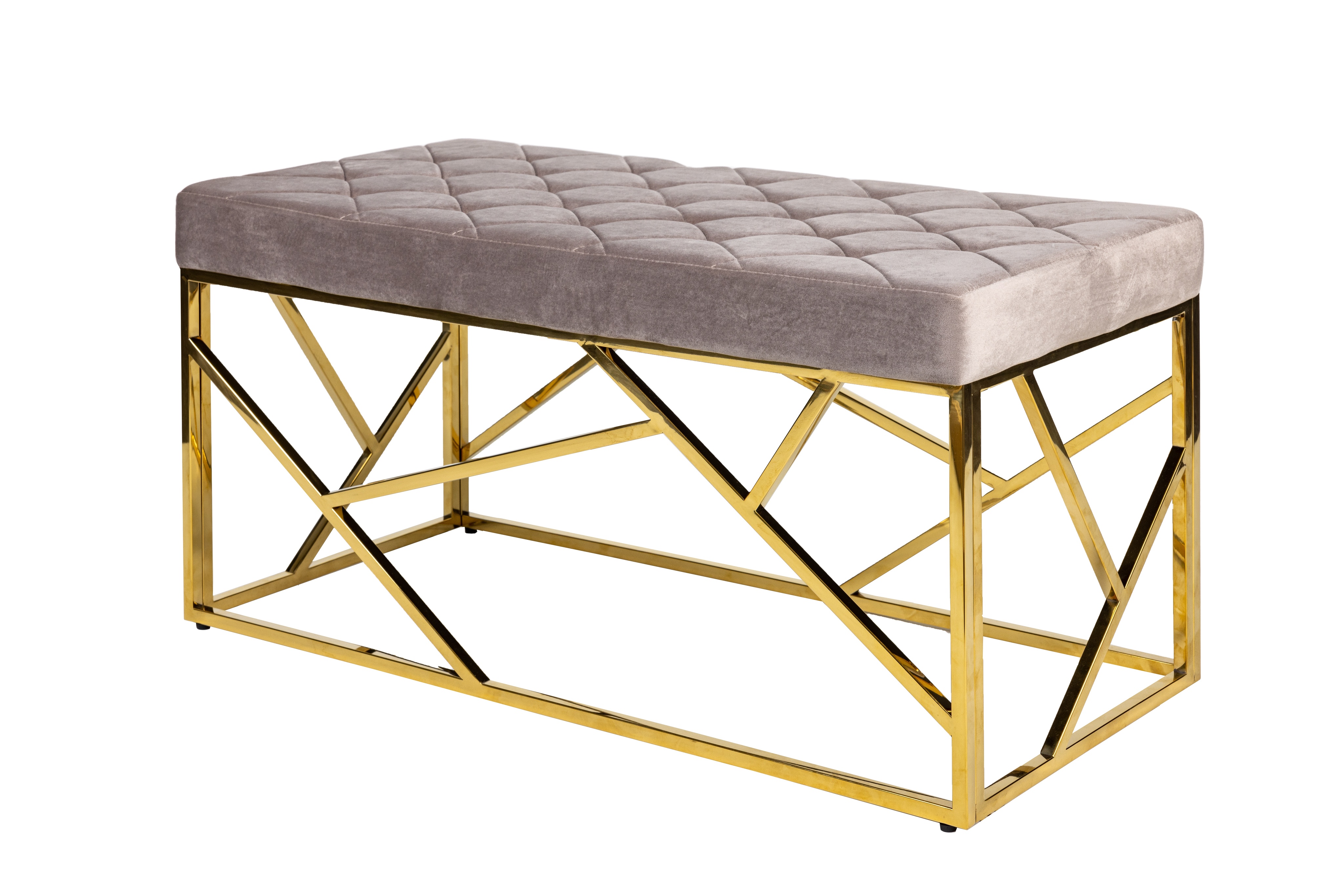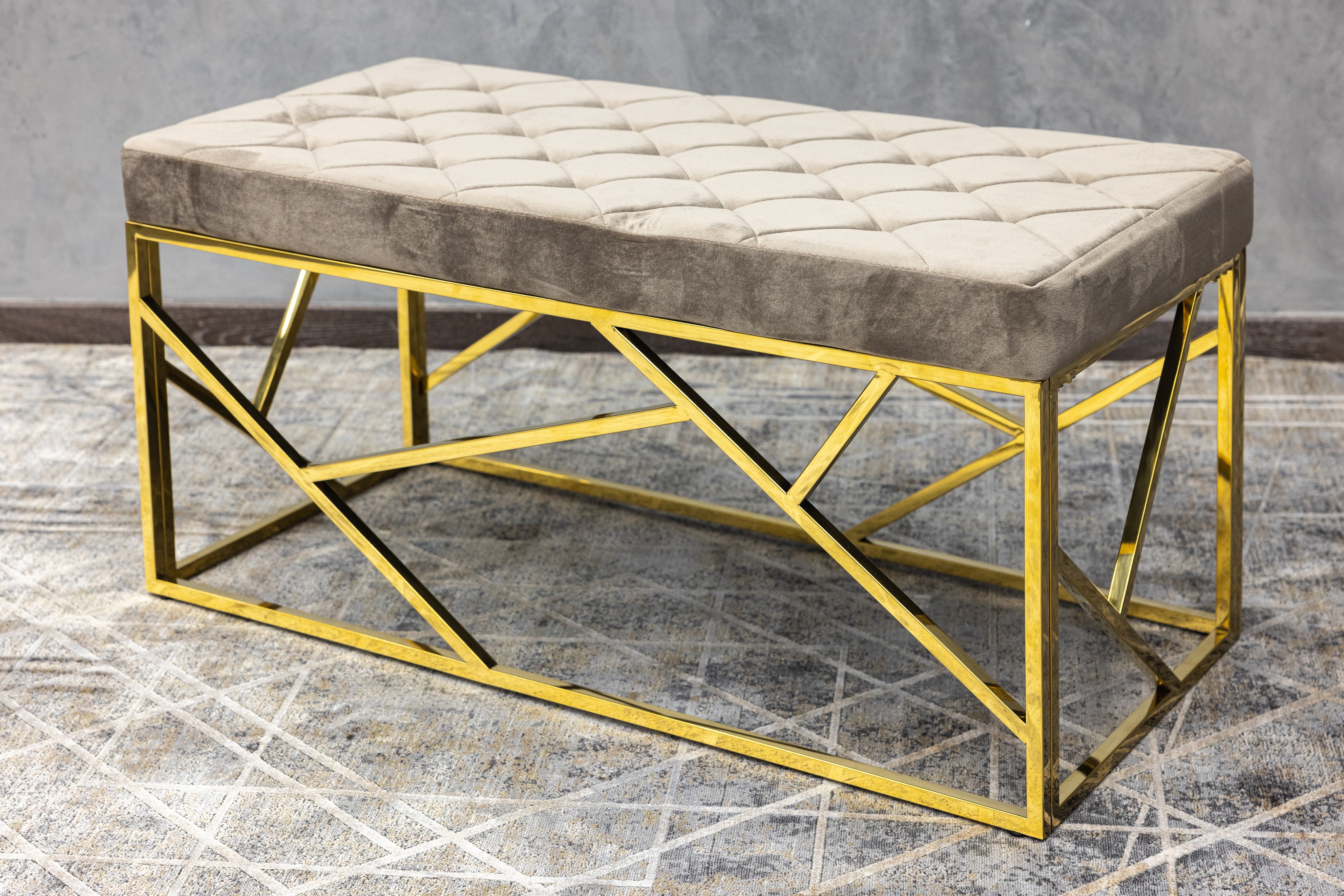 Дизайнерская банкетка Goldy – это идеальное дополнение к вашему интерьеру. Прочный и устойчивый каркас из блестящего золотого металла, в сочетании с обивкой из высококачественного вельвета благородного серого оттенка, делают модель настоящим украшением для спальни или прихожей.