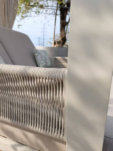 - Толщина матраса 150 мм. Для наполнения матраса используется специально разработанная для уличной мебели быстросохнущая пена. В отличие от обычной пены, быстросохнущие подушки из пены высыхают в мгновение ока. Даже если их замочить в воде, они будут защищены от плесени. Это связано с открытой ячеистой структурой, которая позволяет воде и воздуху легко проходить через материал. Еще одним преимуществом быстросохнущих поролоновых подушек является то, что их гораздо труднее испачкать, чем обычные поролоновые подушки.