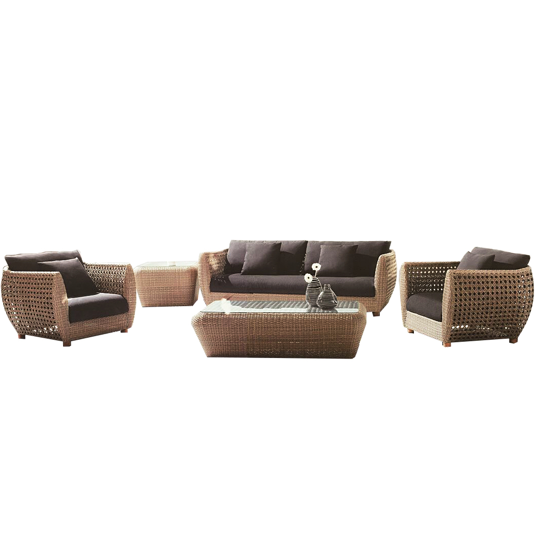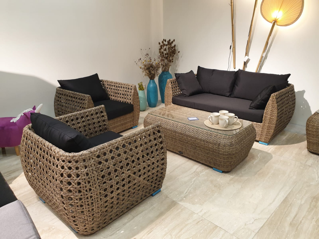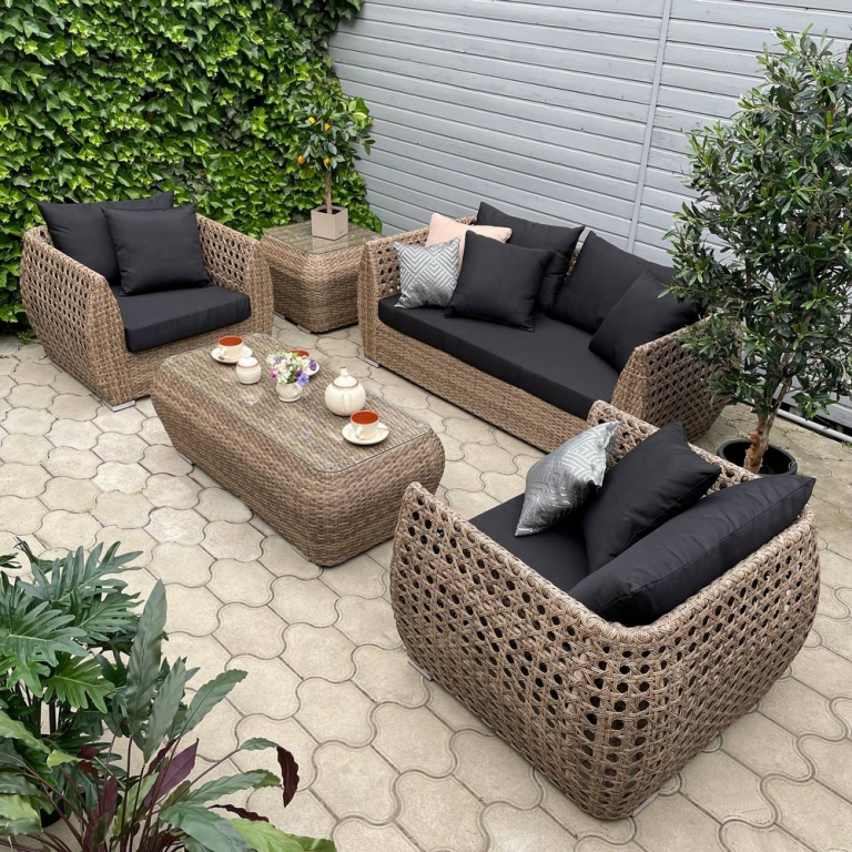 - Мебель выполнена на алюминиевом каркасе с порошковым покрытием, оплетенном искусственным ротангом.