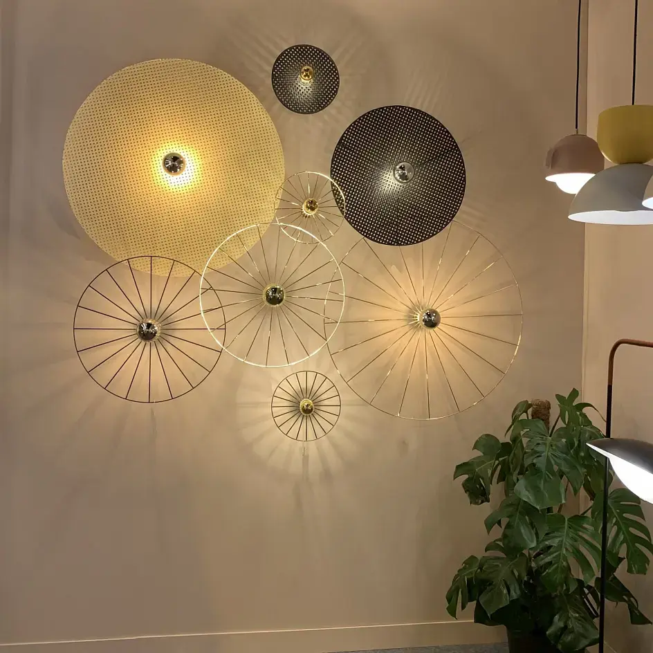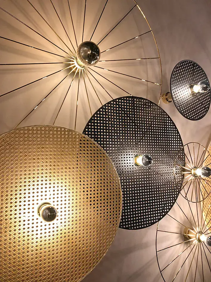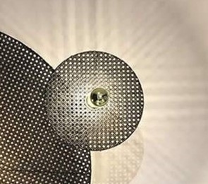 Настенное бра, выполненное из мателла и ротанга в современном стиле. Состоит из металлического фиттинга размером 5 см черного цвета и рассеивающего диска из ротанга 30 см в черном цвете.