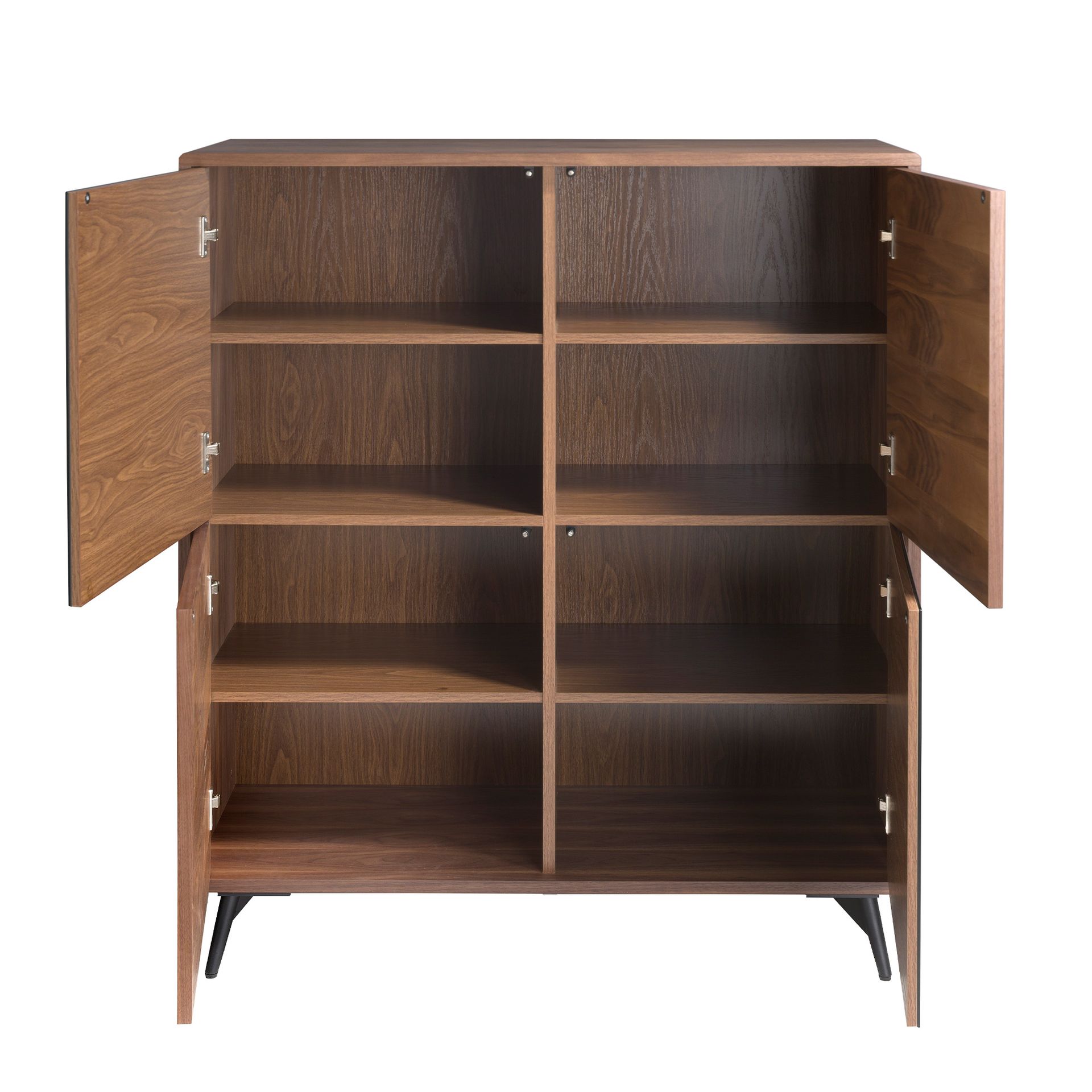 Буфет имеет практически квадратную форму (разница между высотой и шириной составляет всего 14 см). Фасадная сторона состоит из четырех дверей, где две сделаны из орехового шпона, а две — из закаленного ударопрочного стекла матового черного цвета. Все двери оснащены доводчиками на открывание и закрывание.