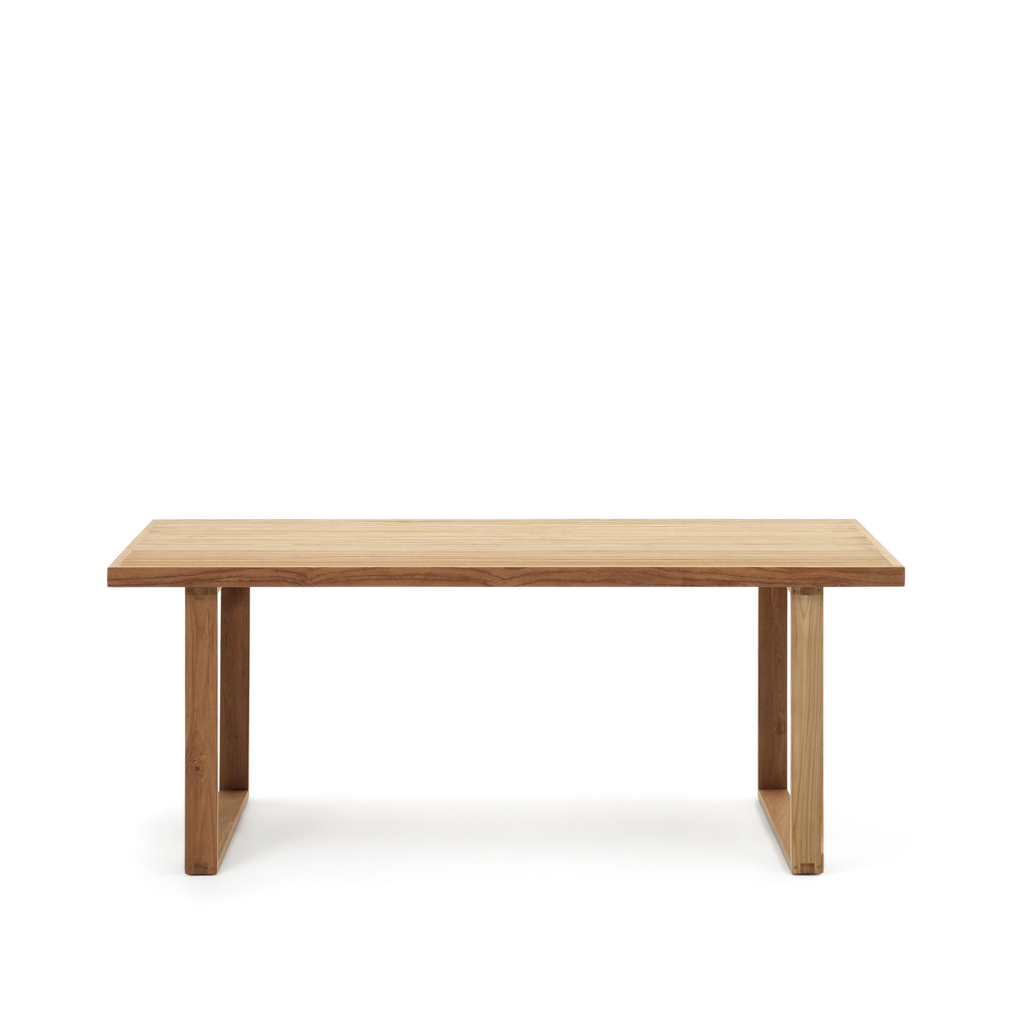 Стол прямоугольный формы, состоит из двух рамочных ножек и реечной столешницы. Он полностью сделан из массива акации в натуральной отделке.