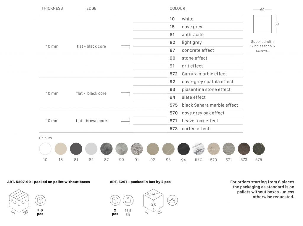 Столешница, выполненная из компакт-ламината, подходит для подстольевNemo, Domino, Tiffany и Cross. Компакт-ламинат (HPL)- это композитный материал из прочных плоских панелей, которые с двух сторон ламинированы пластиком. Столешницы обладаютвысокой устойчивостью к физическому, механическому и температурному воздействию. Отличаются высокой прочностью, ламинированный слой защищает столешницу от различных возможных деформаций и химических воздействий на поверхность. Ламинированные столешницы имеют целый пакет характеристик: ударопрочный материал, защищающий от физических воздействий колющих, режущих и царапающих инструментов, слой ламината-пленки, защищающий поверхность от химических воздействий влаги, кофе, уксуса и других. Помимо всего, ламинированные столешницы имеют большую популярность среди потребителей, обусловленную их высокой практичностью в бытовой и коммерческой сфере. Столешницы HPL очень практичны, прочны и приятно украшают интерьер, отлично подходят для эксплуатации в кафе, барах, ресторанах. Особенности: Толщина 10 мм. Плоский край с черным сердечником. Столешница имеет 12 отверстий для винтов M6. Столешницуможно использовать в помещении и на открытом воздухе. Дополнительную информацию и цены на другие модели Вы можете уточнить у менеджеров.