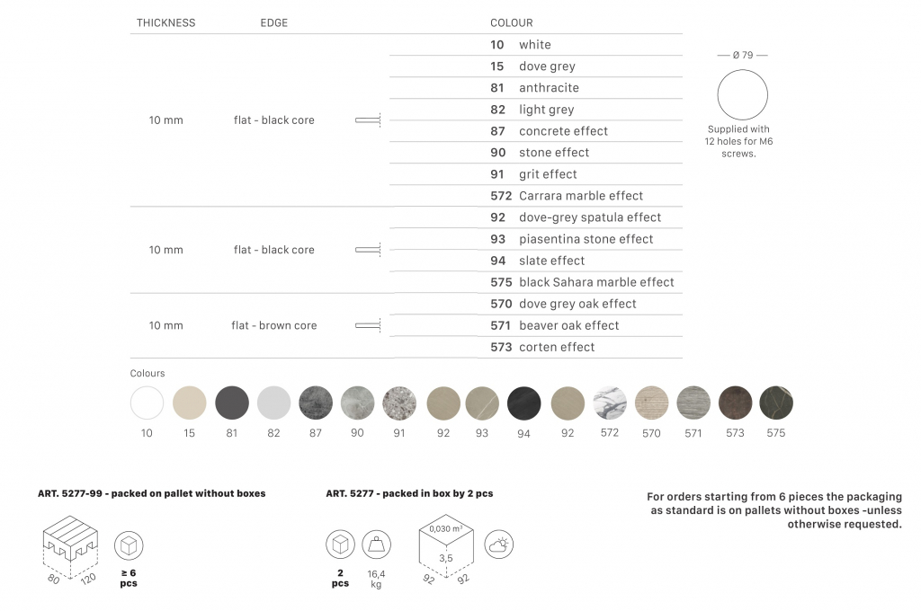 Столешница, выполненная из компакт-ламината, подходит для подстольевNemo, Domino, Tiffany и Cross. Компакт-ламинат (HPL)- это композитный материал из прочных плоских панелей, которые с двух сторон ламинированы пластиком. Столешницы обладаютвысокой устойчивостью к физическому, механическому и температурному воздействию. Отличаются высокой прочностью, ламинированный слой защищает столешницу от различных возможных деформаций и химических воздействий на поверхность. Ламинированные столешницы имеют целый пакет характеристик: ударопрочный материал, защищающий от физических воздействий колющих, режущих и царапающих инструментов, слой ламината-пленки, защищающий поверхность от химических воздействий влаги, кофе, уксуса и других. Помимо всего, ламинированные столешницы имеют большую популярность среди потребителей, обусловленную их высокой практичностью в бытовой и коммерческой сфере. Столешницы HPL очень практичны, прочны и приятно украшают интерьер, отлично подходят для эксплуатации в кафе, барах, ресторанах. Особенности: Толщина 10 мм. Плоский край с черным сердечником. Столешница имеет 12 отверстий для винтов M6. Столешницуможно использовать в помещении и на открытом воздухе. Дополнительную информацию и цены на другие модели Вы можете уточнить у менеджеров.