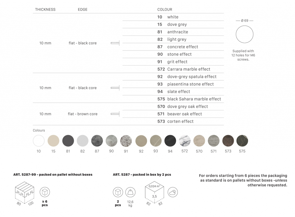 Столешница, выполненная из компакт-ламината, подходит для подстольевNemo, Domino, Tiffany и Cross. Компакт-ламинат (HPL)- это композитный материал из прочных плоских панелей, которые с двух сторон ламинированы пластиком. Столешницы обладаютвысокой устойчивостью к физическому, механическому и температурному воздействию. Отличаются высокой прочностью, ламинированный слой защищает столешницу от различных возможных деформаций и химических воздействий на поверхность. Ламинированные столешницы имеют целый пакет характеристик: ударопрочный материал, защищающий от физических воздействий колющих, режущих и царапающих инструментов, слой ламината-пленки, защищающий поверхность от химических воздействий влаги, кофе, уксуса и других. Помимо всего, ламинированные столешницы имеют большую популярность среди потребителей, обусловленную их высокой практичностью в бытовой и коммерческой сфере. Столешницы HPL очень практичны, прочны и приятно украшают интерьер, отлично подходят для эксплуатации в кафе, барах, ресторанах. Особенности: Толщина 10 мм. Плоский край с черным сердечником. Столешница имеет 12 отверстий для винтов M6. Столешницуможно использовать в помещении и на открытом воздухе. Дополнительную информацию и цены на другие модели Вы можете уточнить у менеджеров.