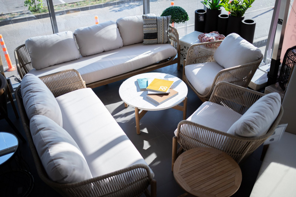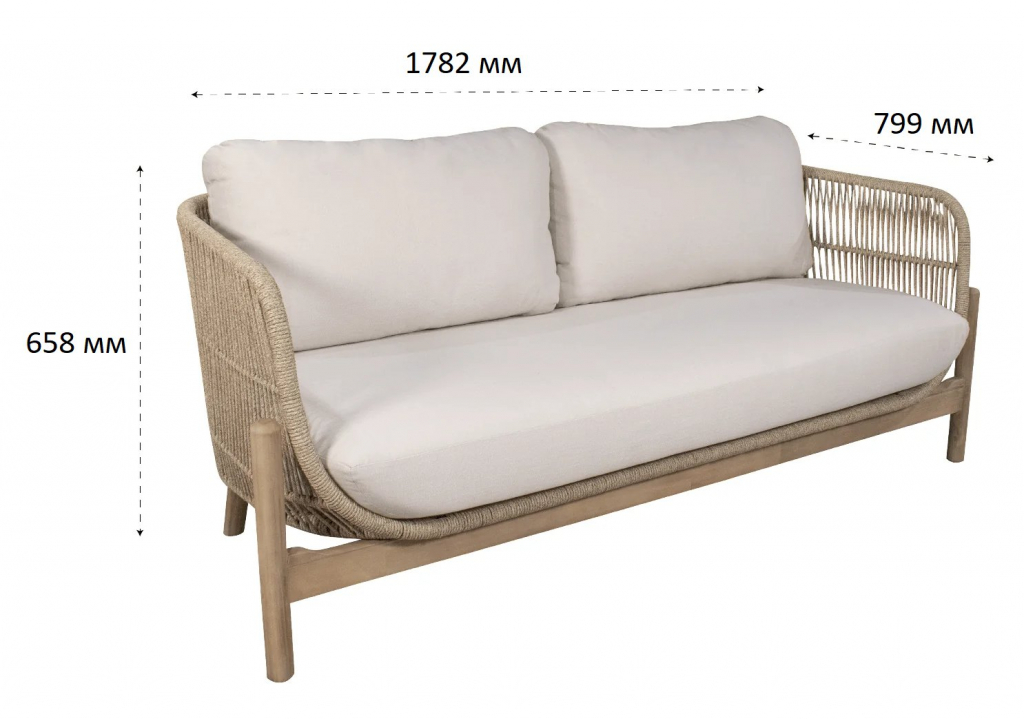 Крепкая алюминиевая рама оплетена синтетическим роупом. Обивка подушек выполнена из ткани олефин - прочного материала, устойчивого к воздействию грязи, влаги и УФ-лучей.