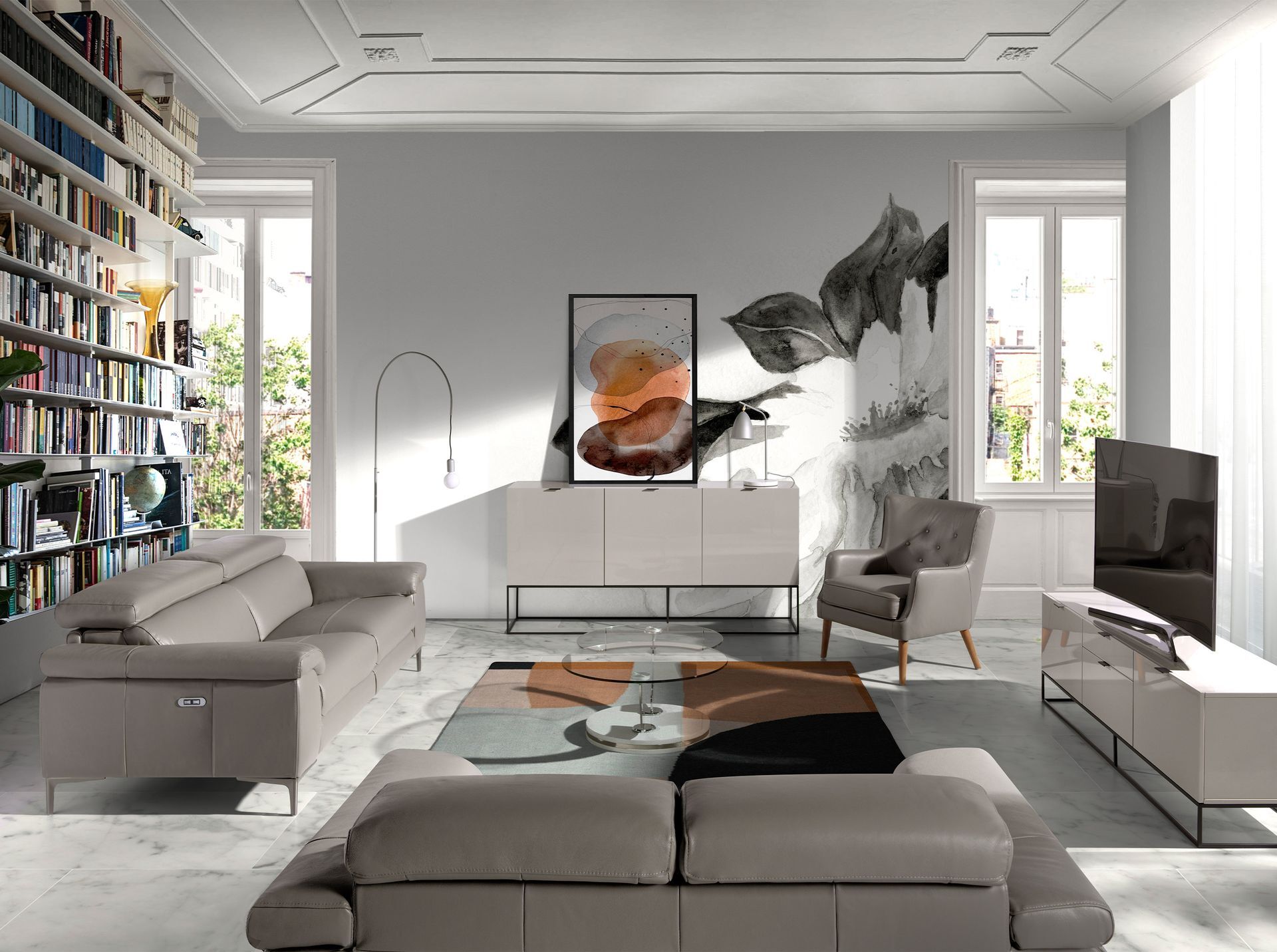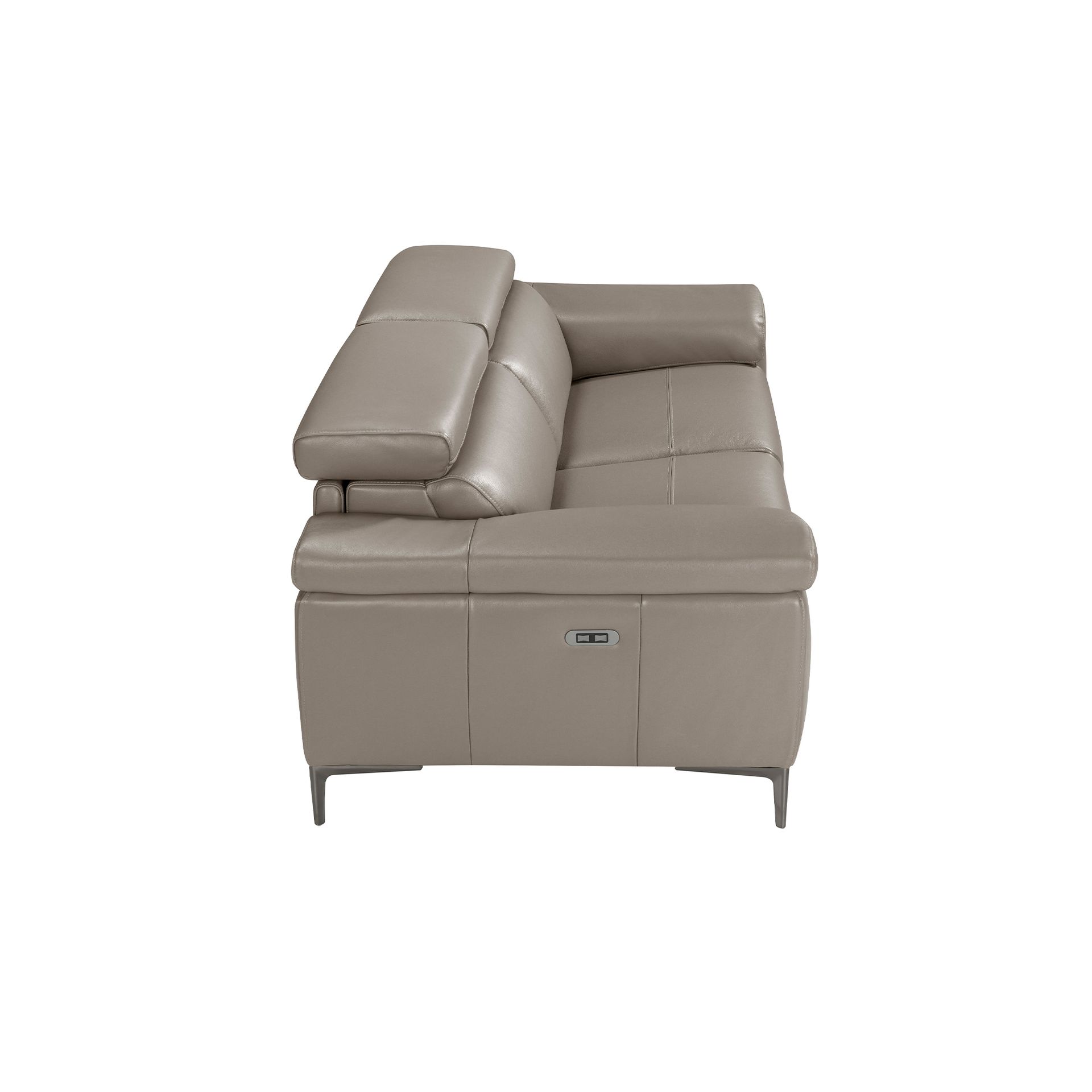 Трехместный диван с обивкой из воловьей кожи с электрическим механизмом релаксации. Независимые регулируемые подголовники. Ножки из затемненной полированной нержавеющей стали.