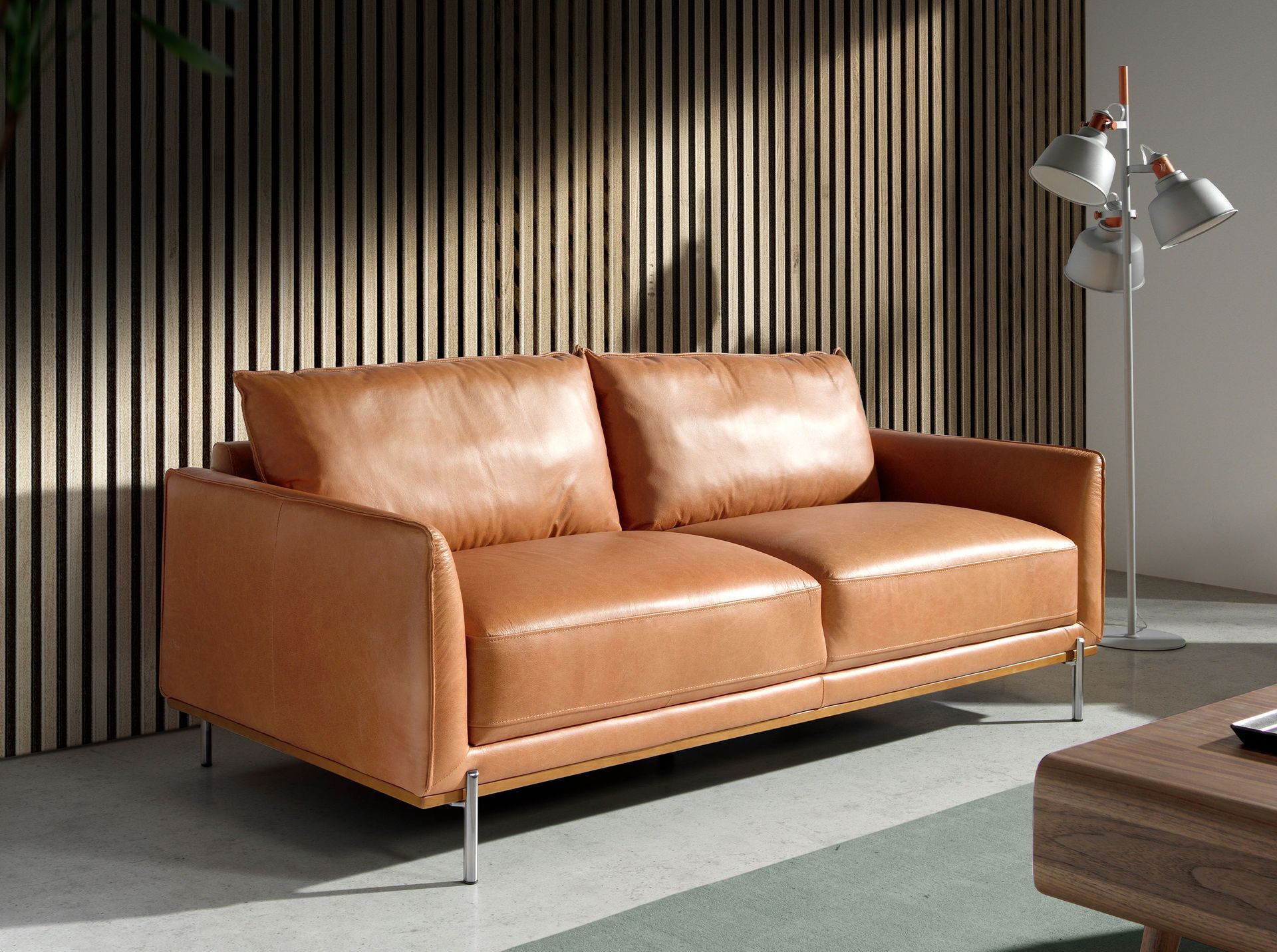 Трехместный диван с обивкой из коричневой воловьей кожи буйвола и основанием из пропаренного бука. Структура ножек из твердой полированной нержавеющей стали.