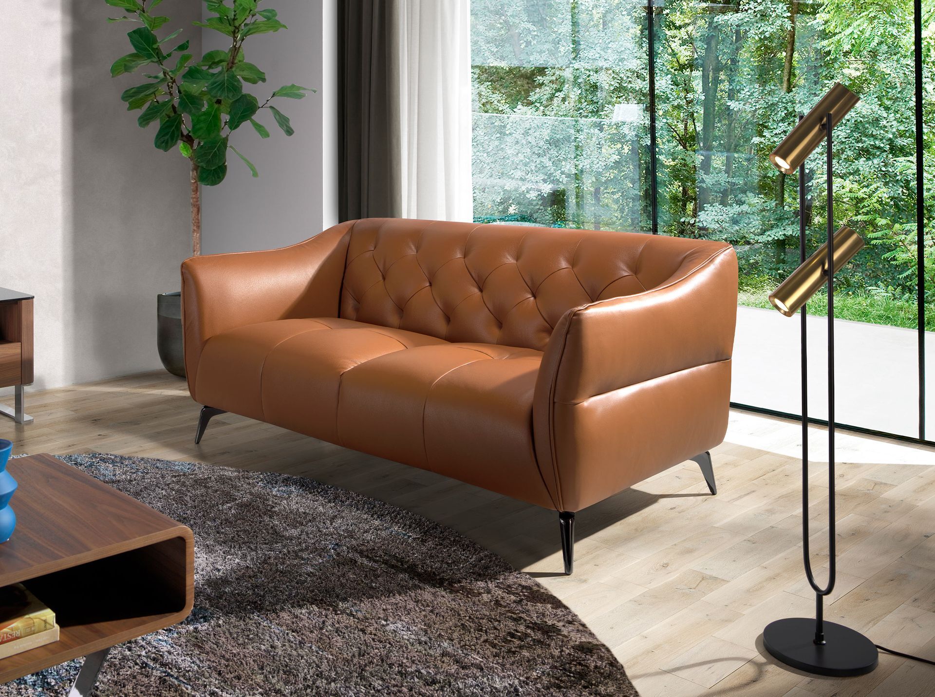 2-местный диван с обивкой из воловьей кожи со стеганой спинкой. Внутренняя структура из натуральной сосны и ножки из массивной затемненной нержавеющей стали.