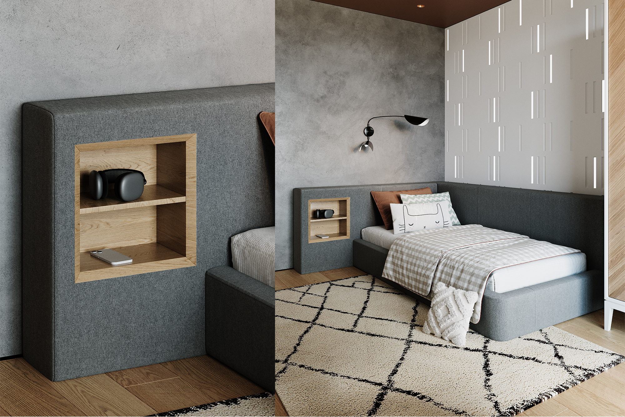Оснащена подъёмным механизмом, местом для хранения, нишей и розеткой