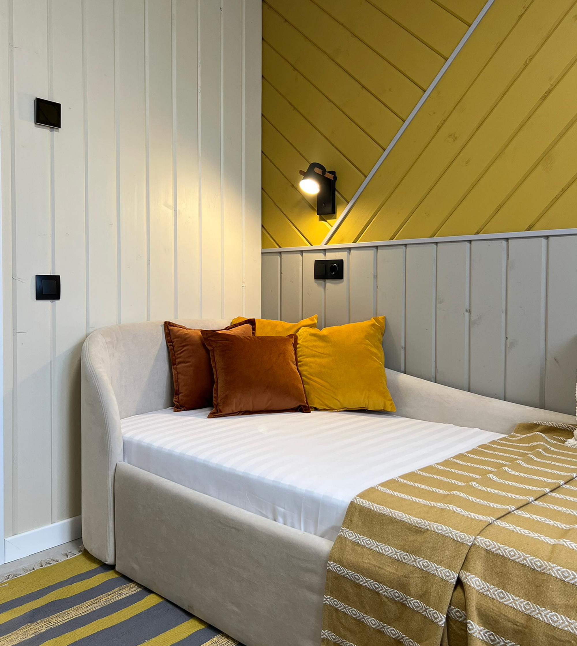 Закруглённые углы и мягкая приятная на ощупь обивка делают диван уютным и безопасным