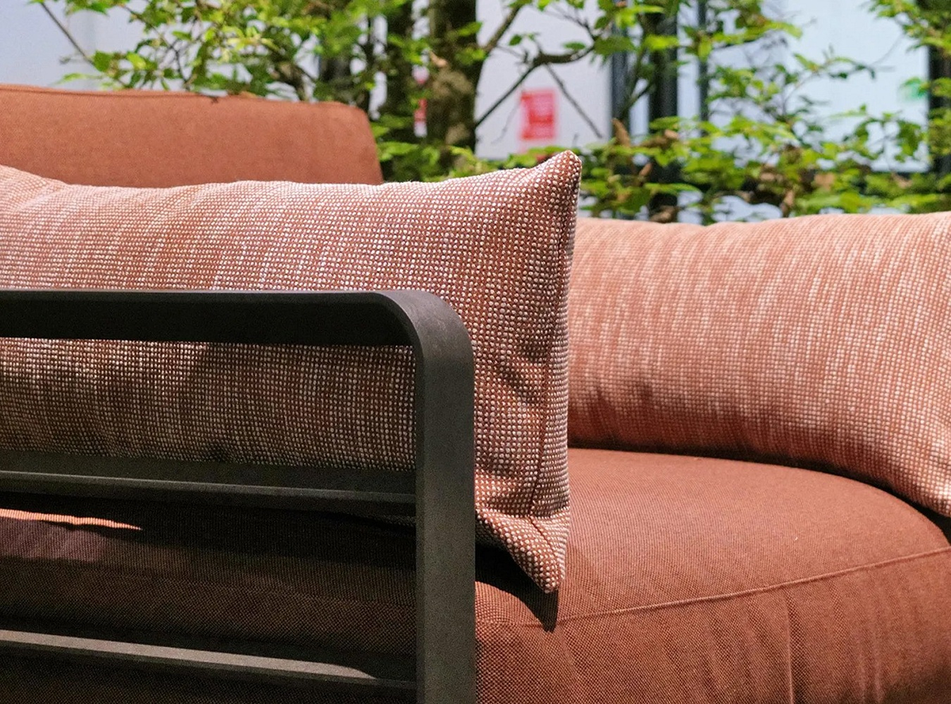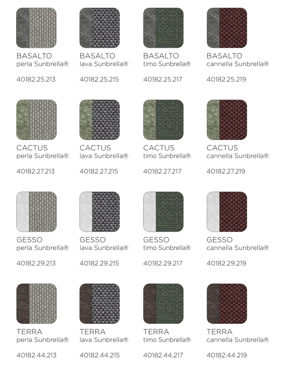 - Обивка подушек - акриловая ткань Sunbrella: 50% переработанного и окрашенного в массе акрилового волокна Sunbrella, 47% окрашенного в массе волокна Sunbrella®, 3% полиэстера. Светостойкость 8/8, стирка при 30°, водоотталкивающая обработка без PFAS, грязеотталкивающая обработка.