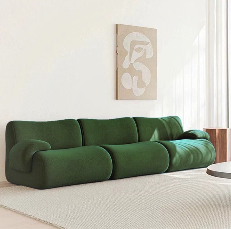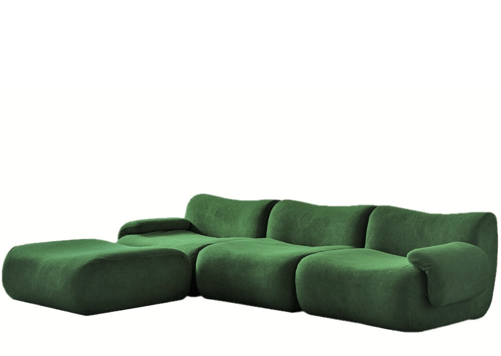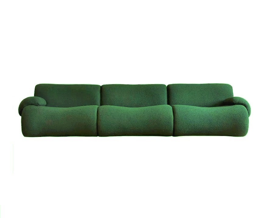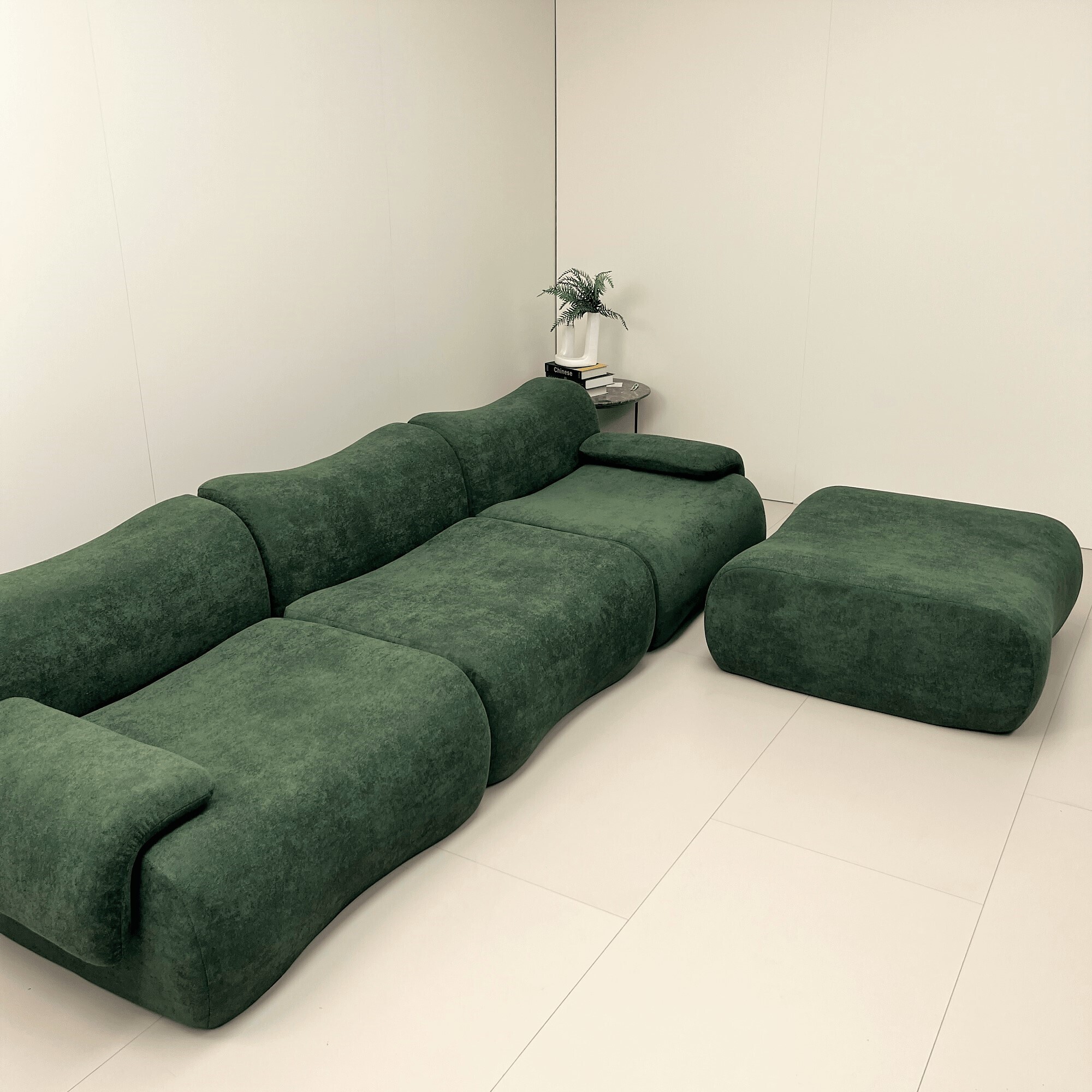 Диван в мягкой ткани велюр темно-зеленого цвета.