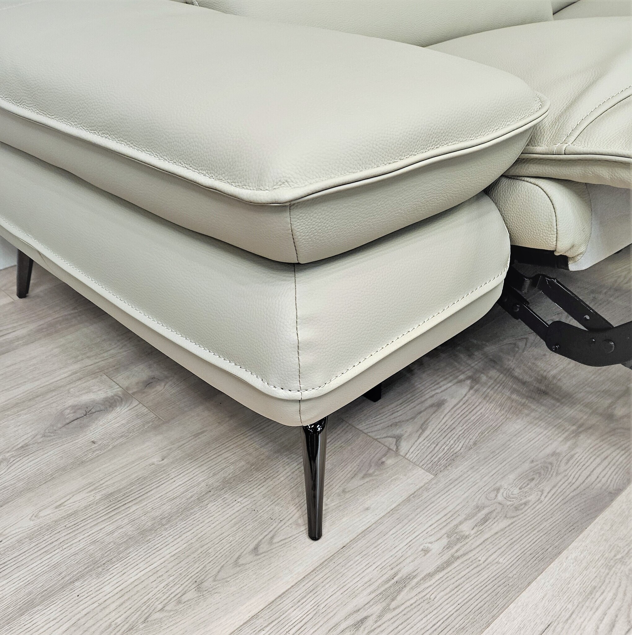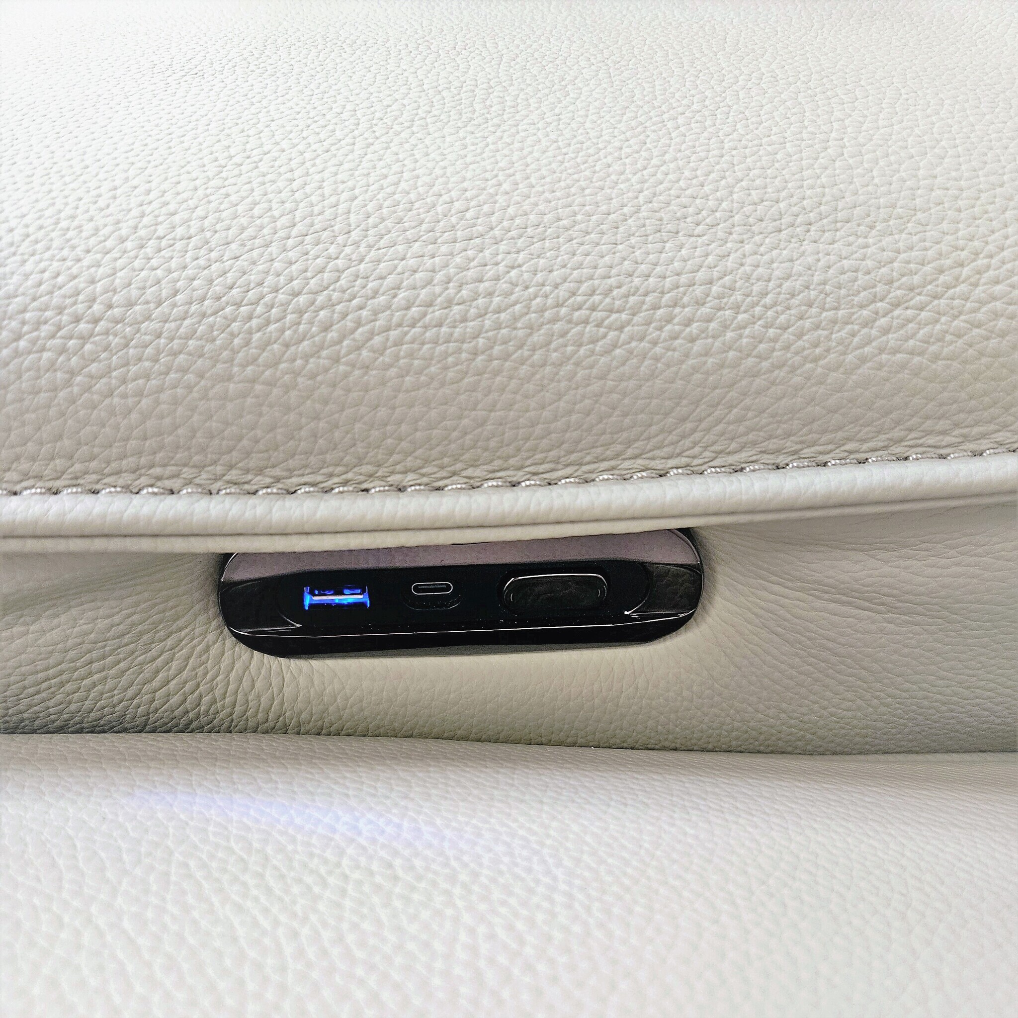 Реклайнер позволяет менять наклон спинки и поднимать подножку до полулежащего положения. Кнопка каждого электромеханизма находится на внутренней части подлокотника, там же встроен порт USB и Type-C.