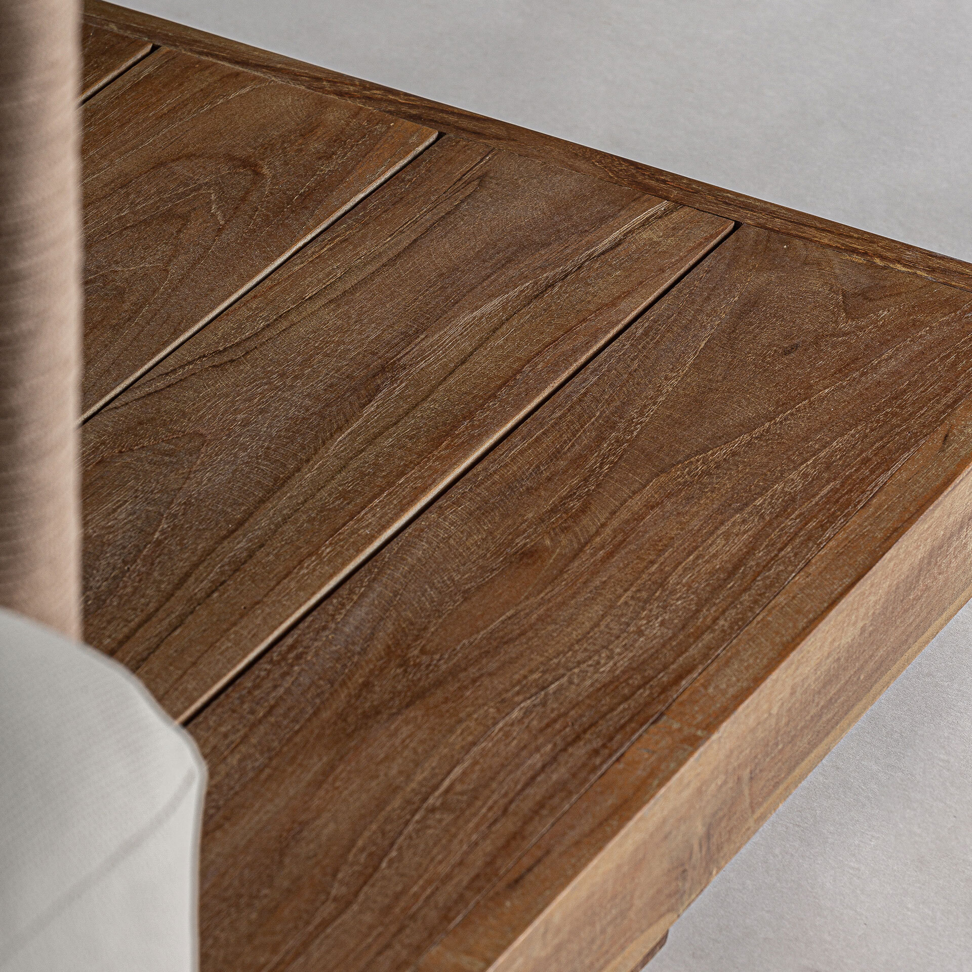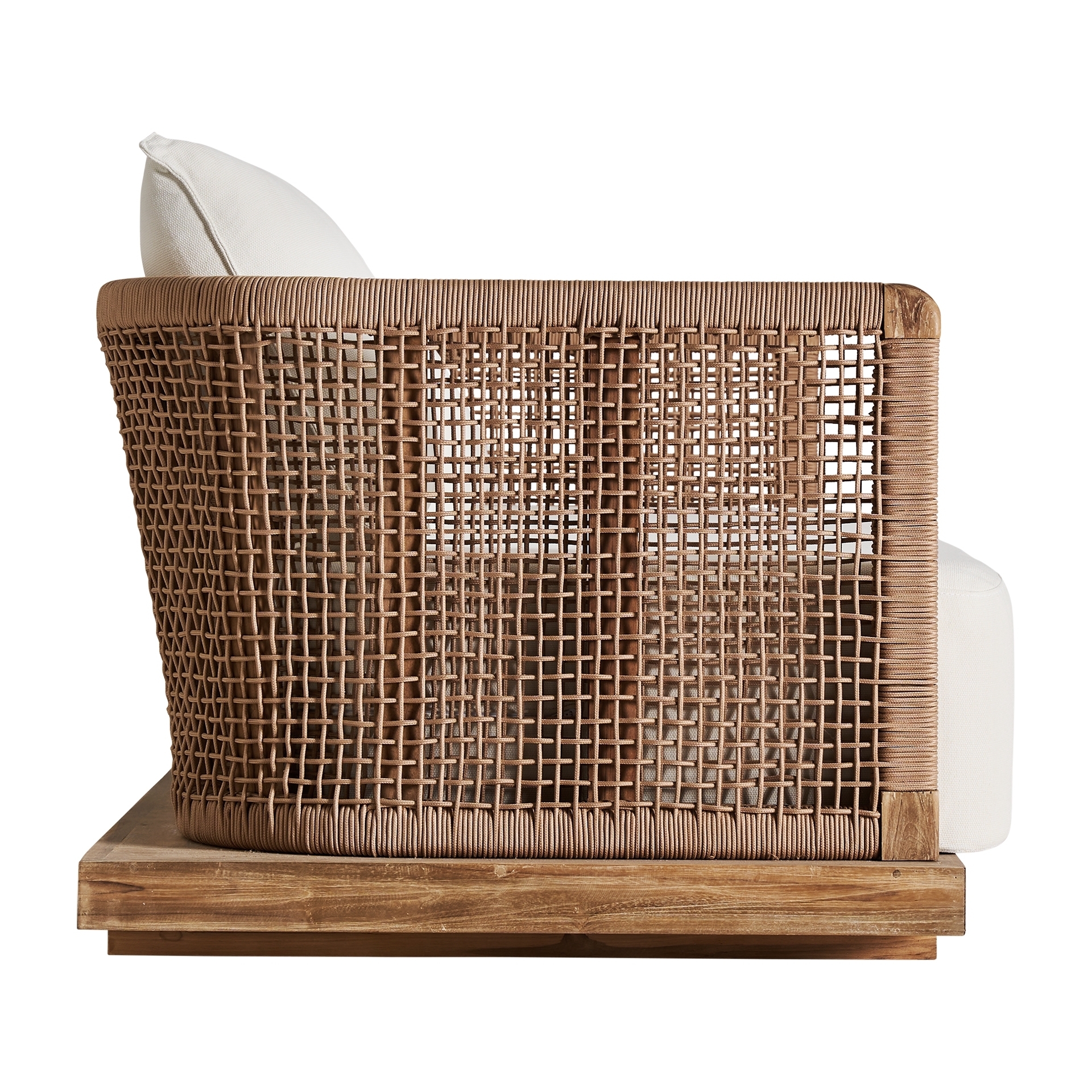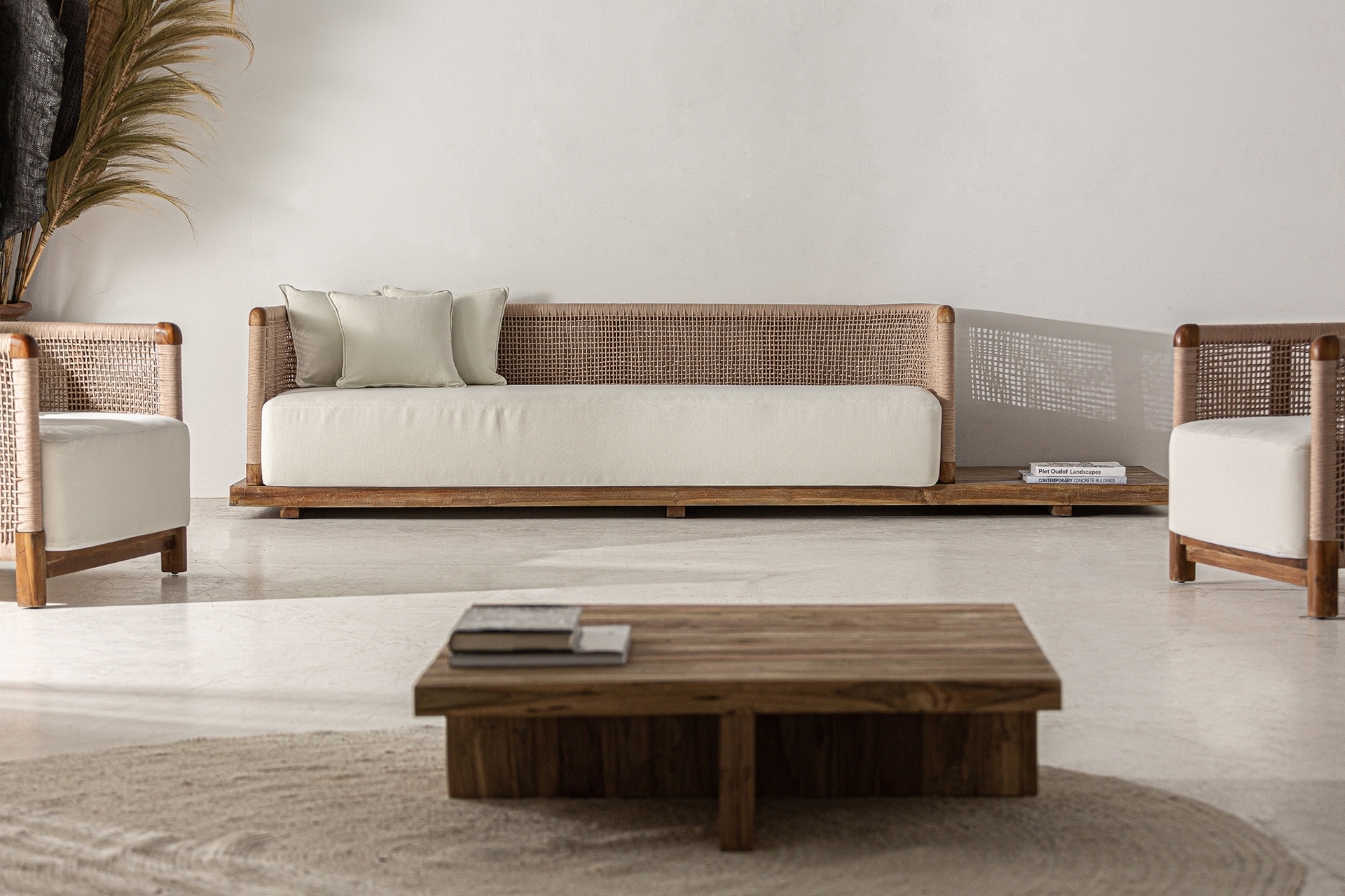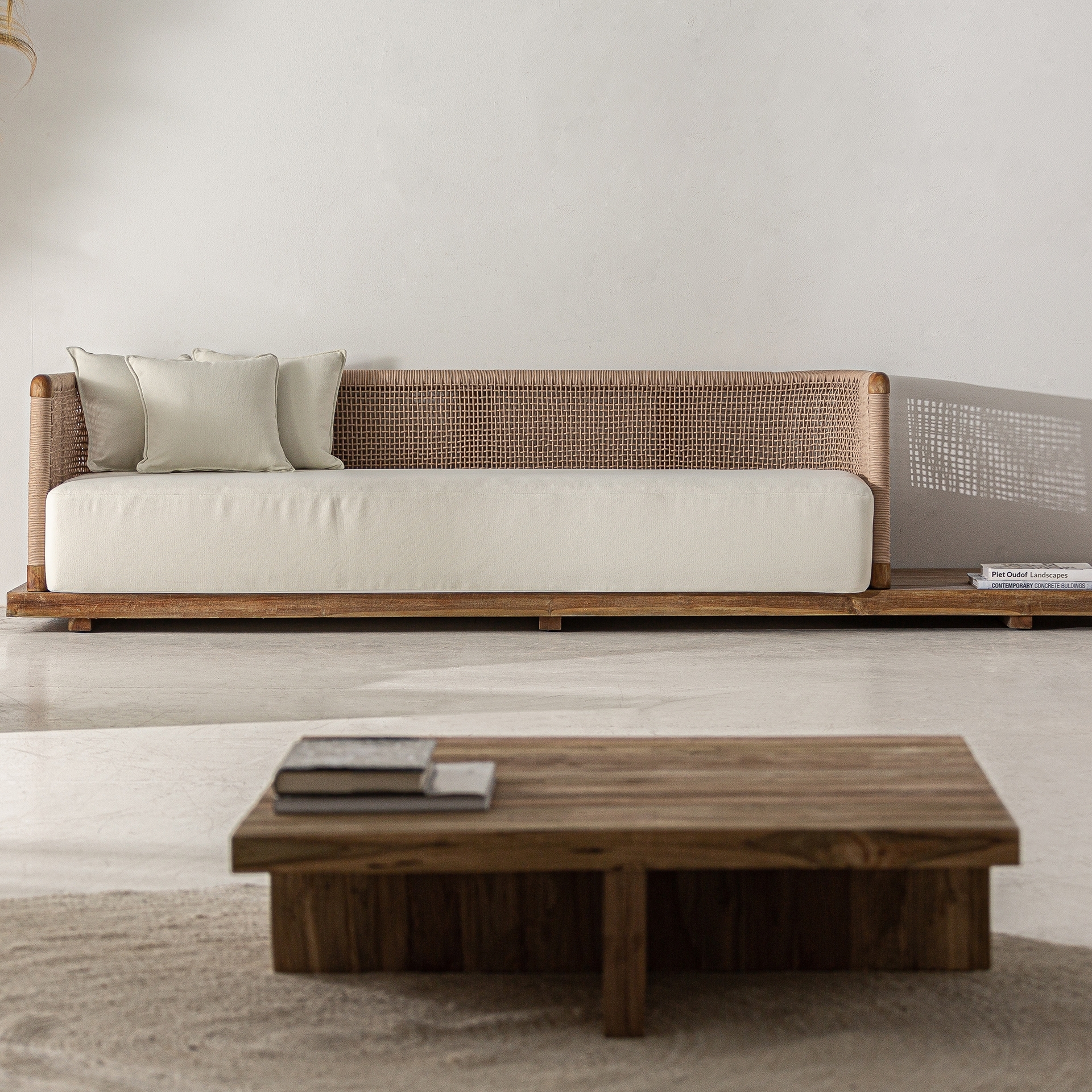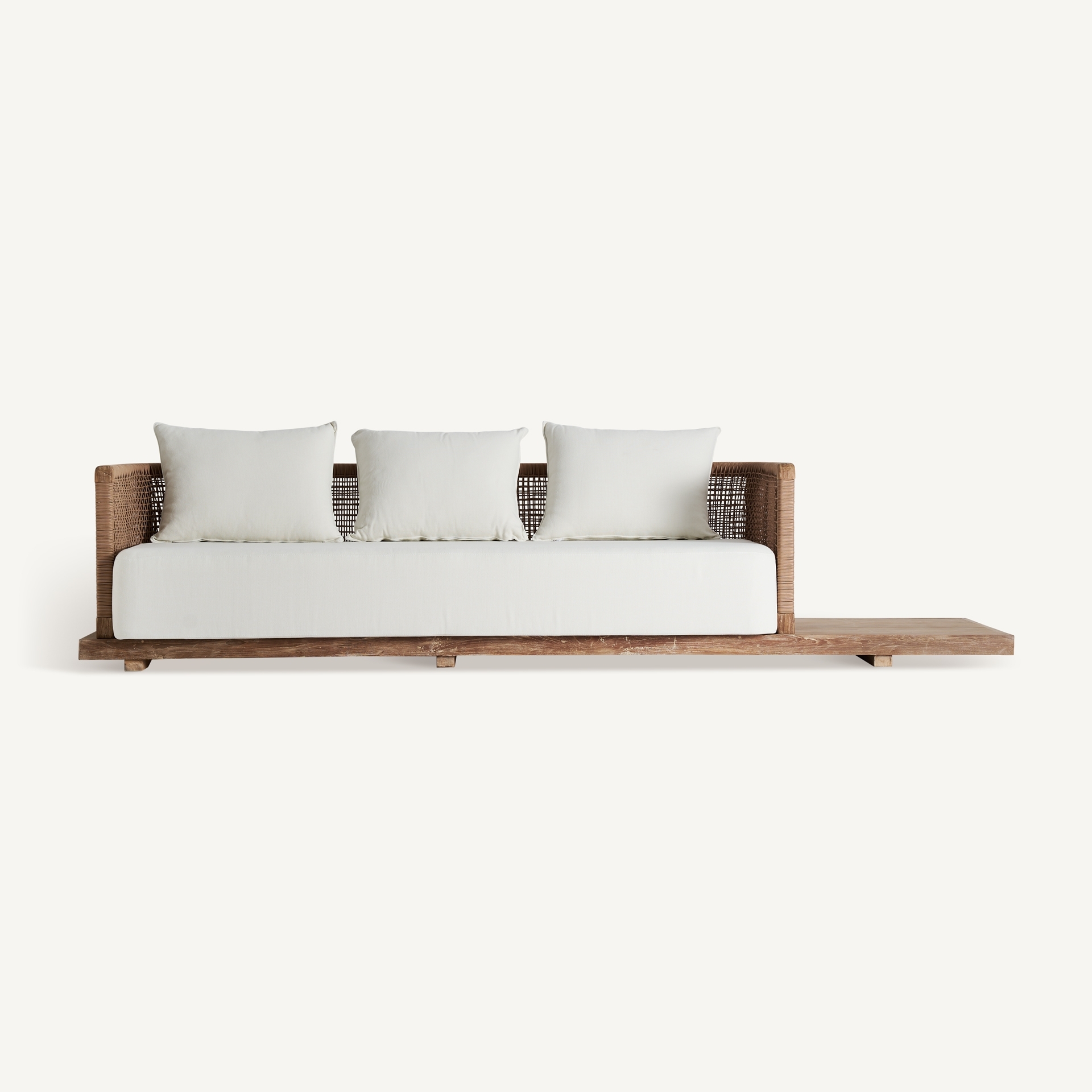 Диван Trena превратит любое открытое пространство в оазис. Каркас из переработанного тика и обивка из белого переработанного полипропилена делают его съёмным и складным предметом мебели, воплощающим гармонию. Безупречное сочетание натуральной эстетики и современного комфорта.