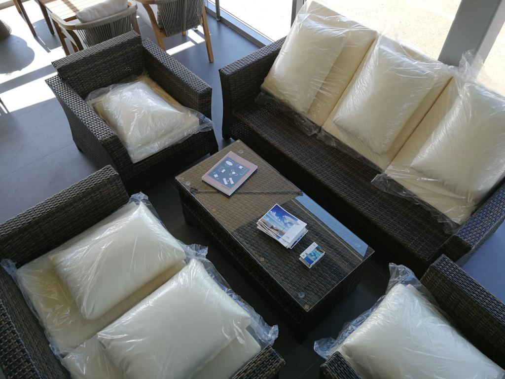 - Обивка подушек выполнена из водоотталкивающей ткани (акрил).