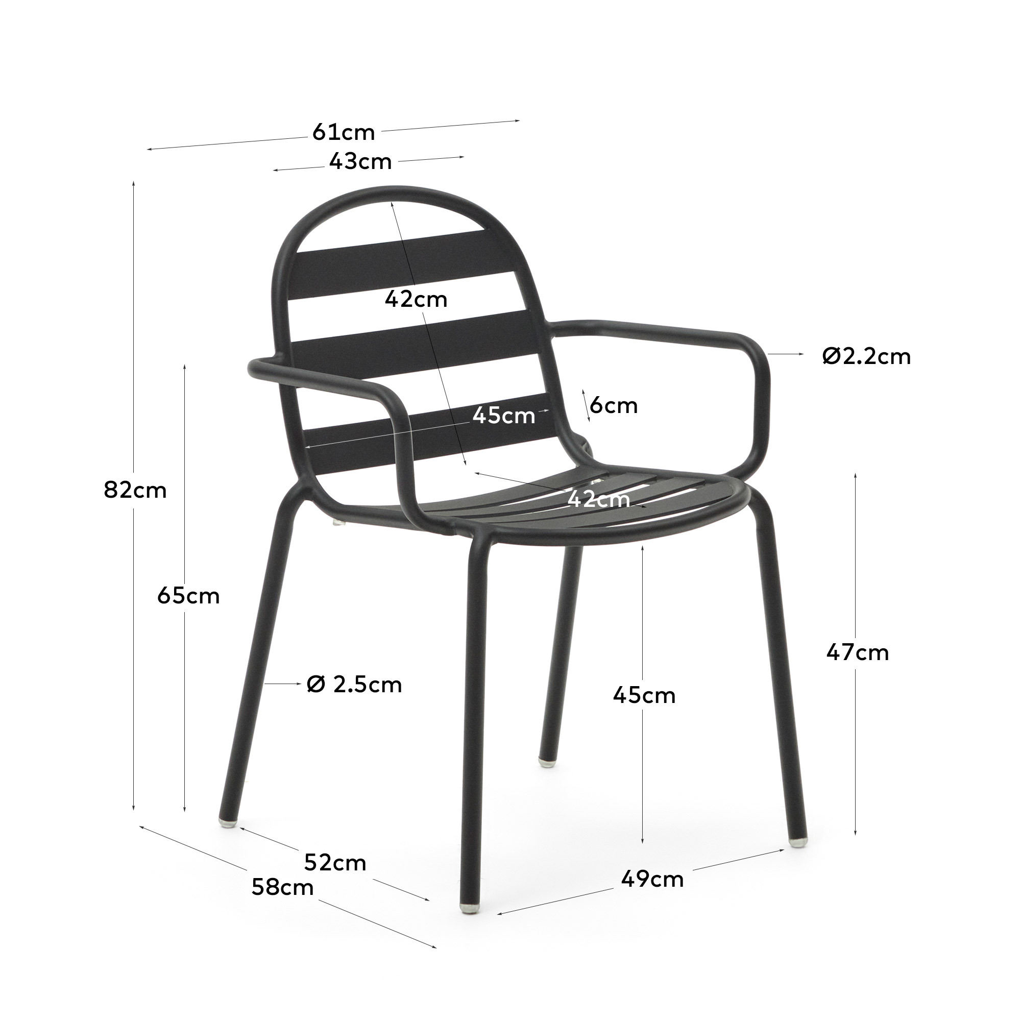 Стул металлический (100% алюминий), окрашен в черный цвет по методу порошкового нанесения краски. Так поверхность идеально гладкая и защищена от появления коррозии и негативного воздействия ультрафиолета.
