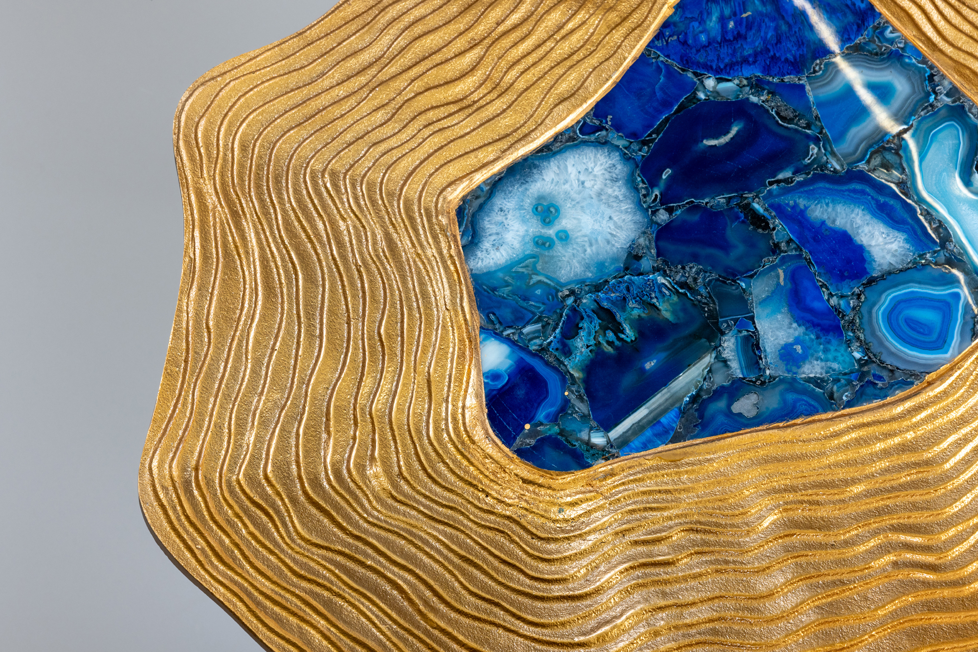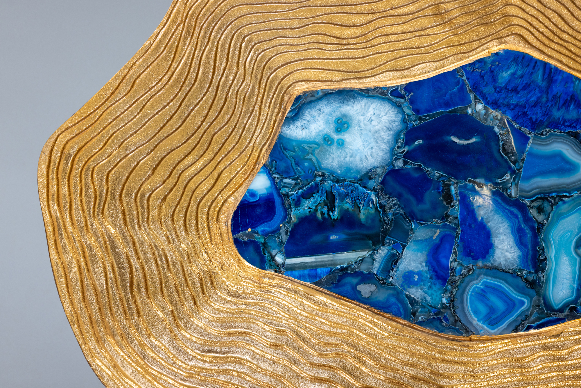 Журнальный столик Agate является настоящим воплощением стиля. Столешница из алюминия украшена вставкой из натурального среза агата. Изделие полностью выполнено вручную нашими мастерами из Индии и выпускается ограниченной серией.