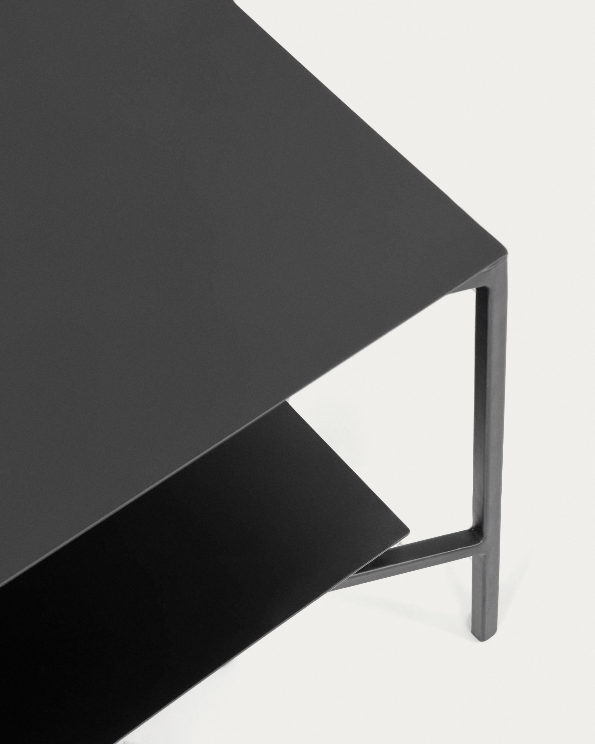 Стол прямоугольной формы, полностью сделан из металла. Сверху нанесено матовое черное покрытие. Столешница и полка имеют толщину 2 мм. Суммарно они способны выдерживать нагрузку до 30 кг (для одной полки допускается вес до 20 кг).