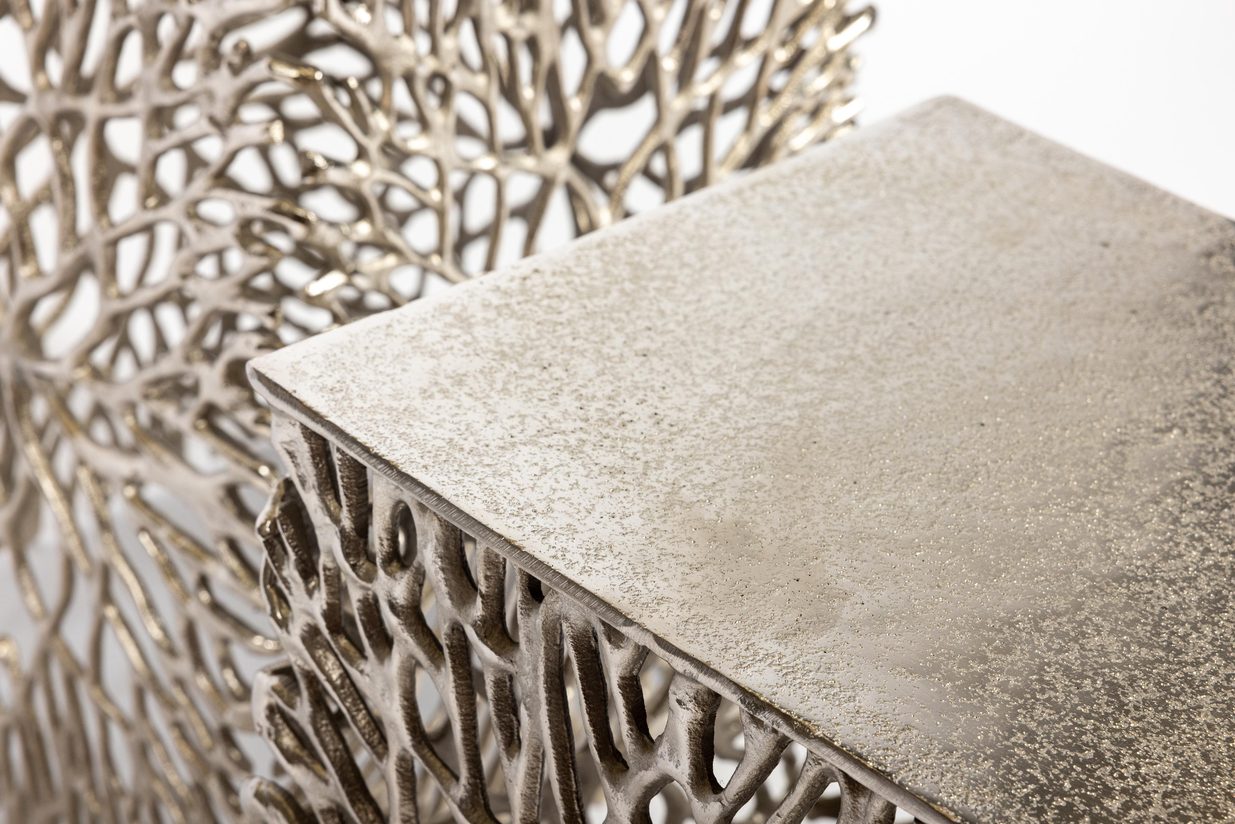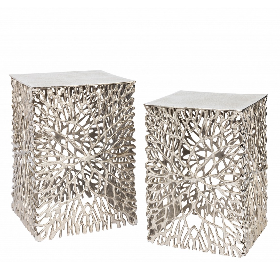 Дизайнерский сэт из 2-х кофейных столиков Design . Модель изготовлена из прочного металла цвета серебра, а стильное основание украшено необычным узором, выполненным полностью вручную. Настоящее украшение для вашего интерьера.