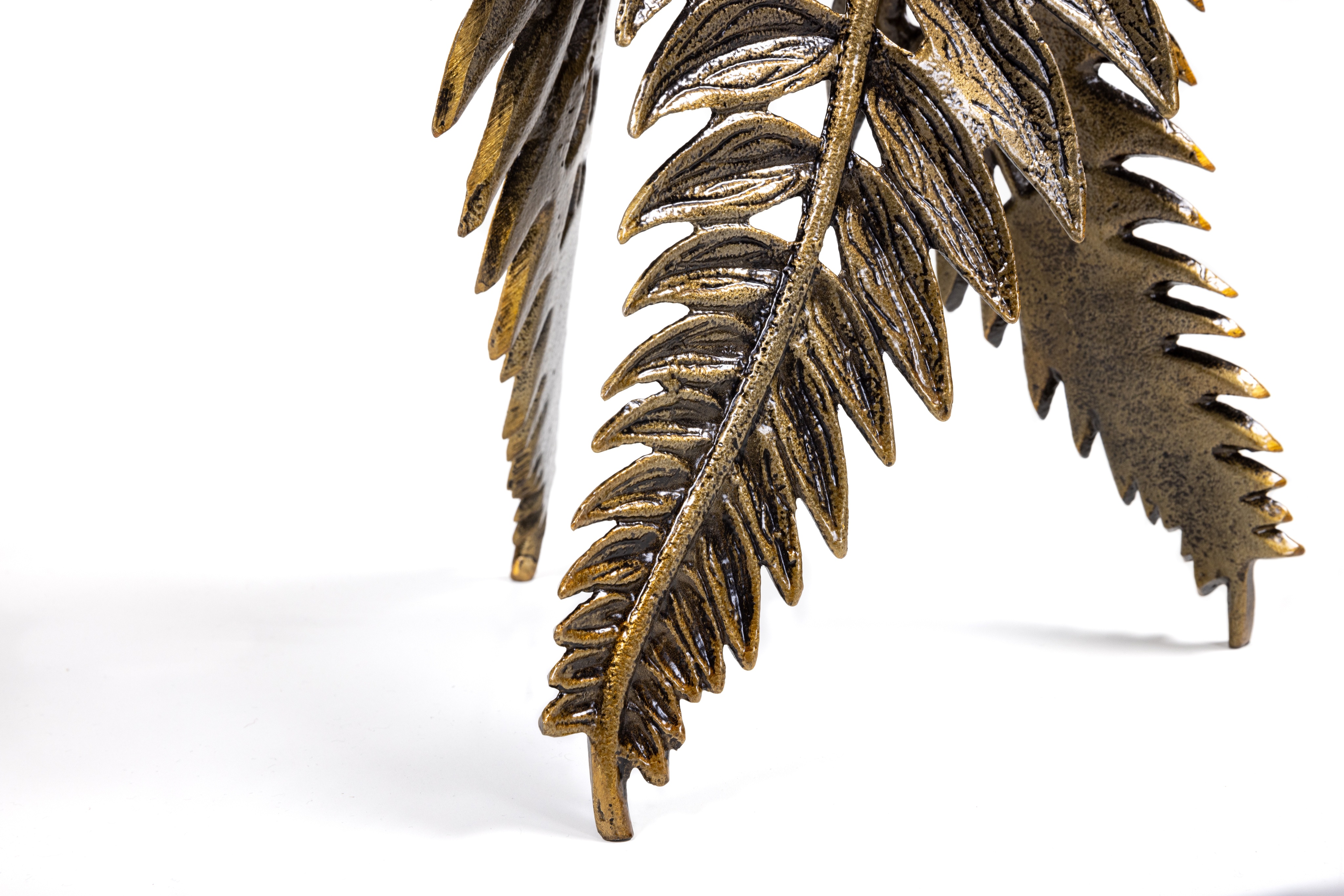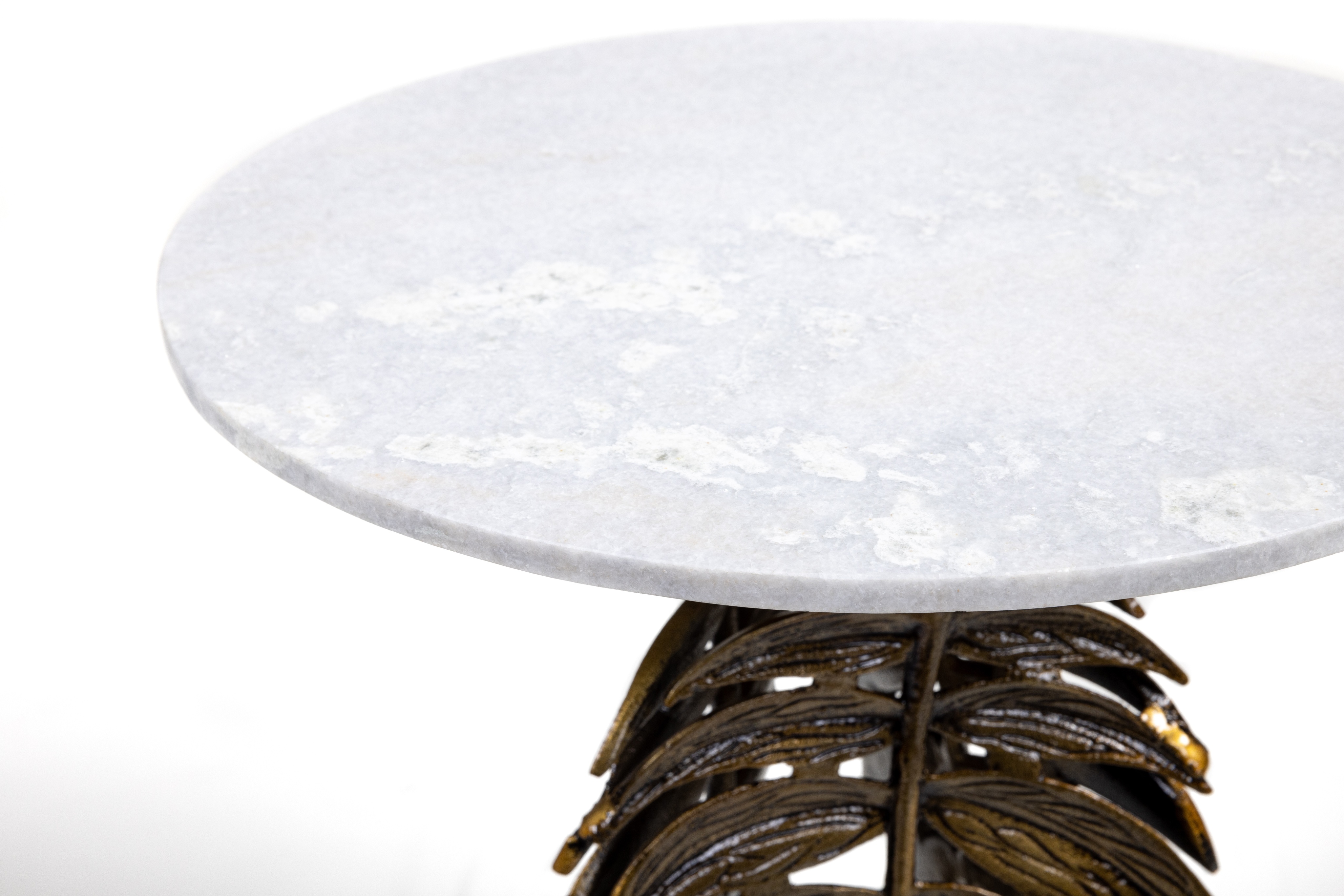 Основание эксклюзивного столика Frond выполнено в форме листьев цвета латуни. Столешница изготовлена из натурального белого мрамора. Такое сочетание выглядит стильно и дорого. Дизайнерский столик подойдет для прихожей, гостиной или спальной комнаты.