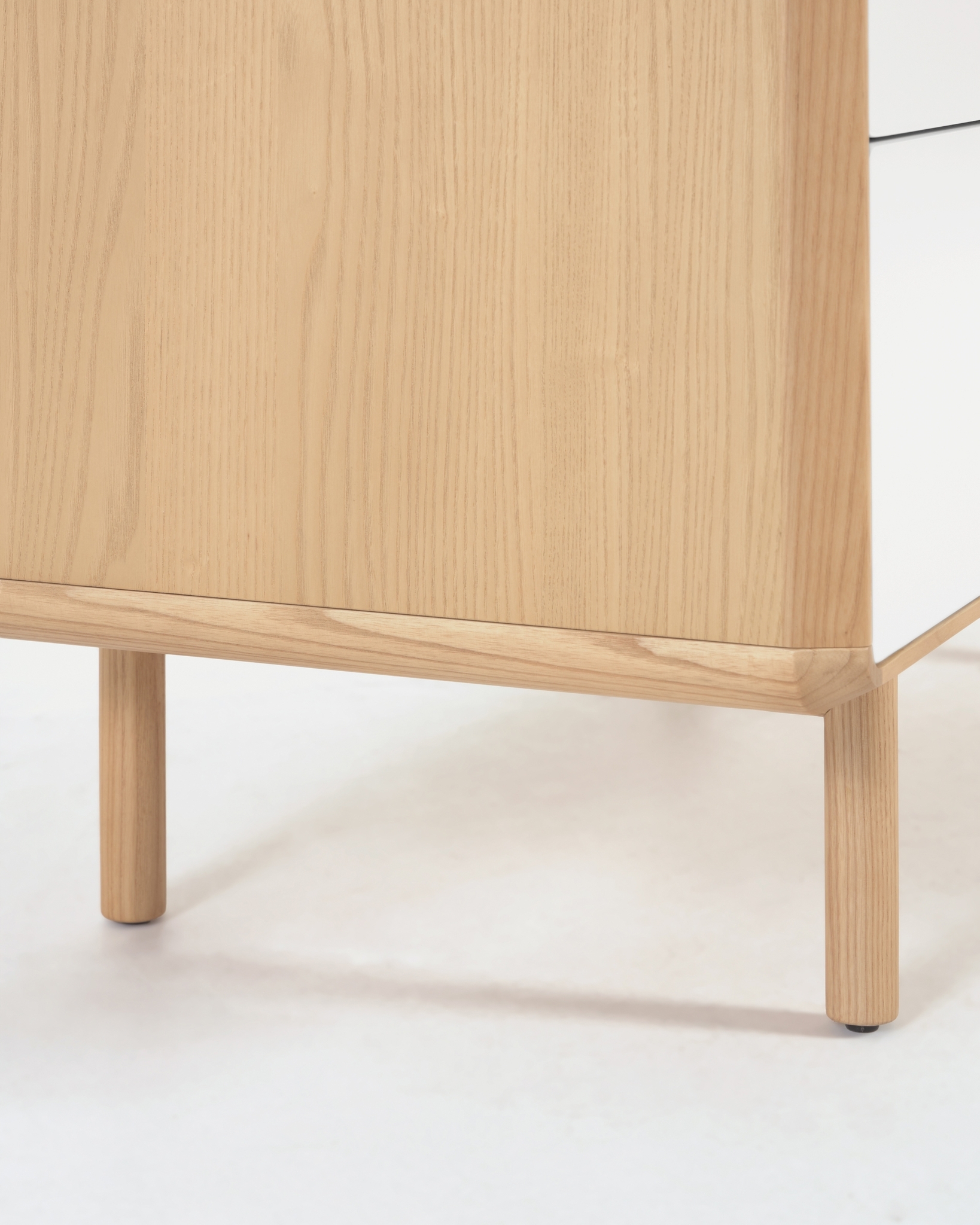 Комод из ясеневого шпона с ножками и каркасом из массива ясеня. Ящики с плавным закрыванием, механизмом открывания push-to-open и регулируемыми ножками. Фасад окрашен в серо-белый цвет.