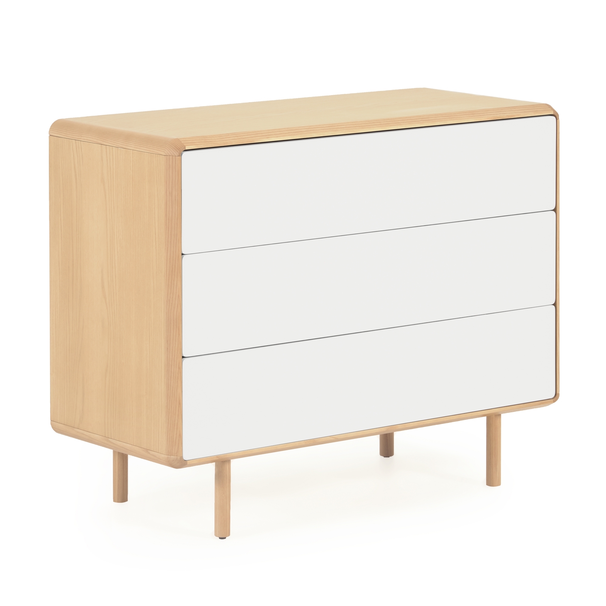 Комод из ясеневого шпона с ножками и каркасом из массива ясеня. Ящики с плавным закрыванием, механизмом открывания push-to-open и регулируемыми ножками. Фасад окрашен в серо-белый цвет.