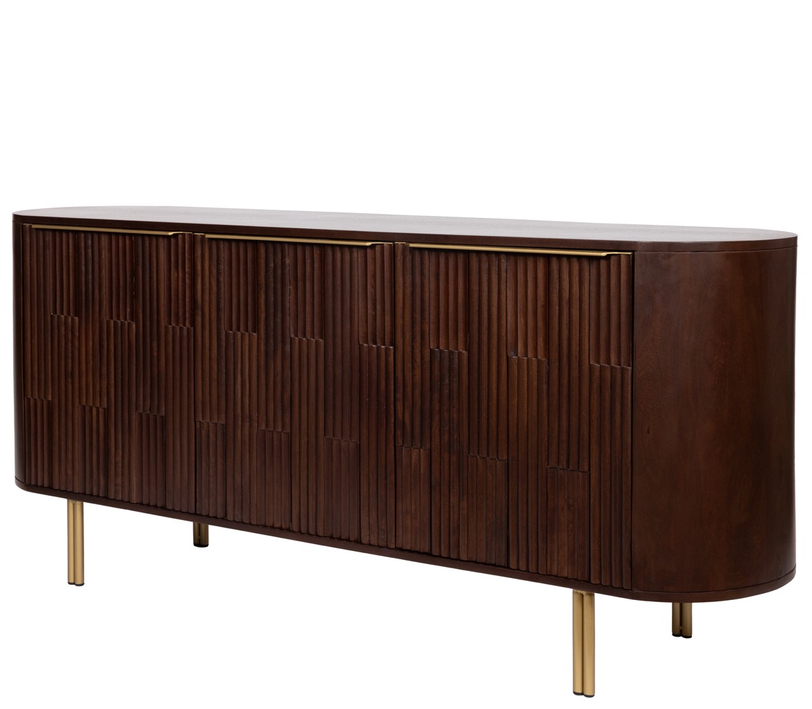 Дизайнерский комод Mango, выполненный в коричневых тонах, изготовлен с использованием ценной породы дерева Манго. Опоры и ручки цвета матового золота. Модель отличают элегантные округлые формы.