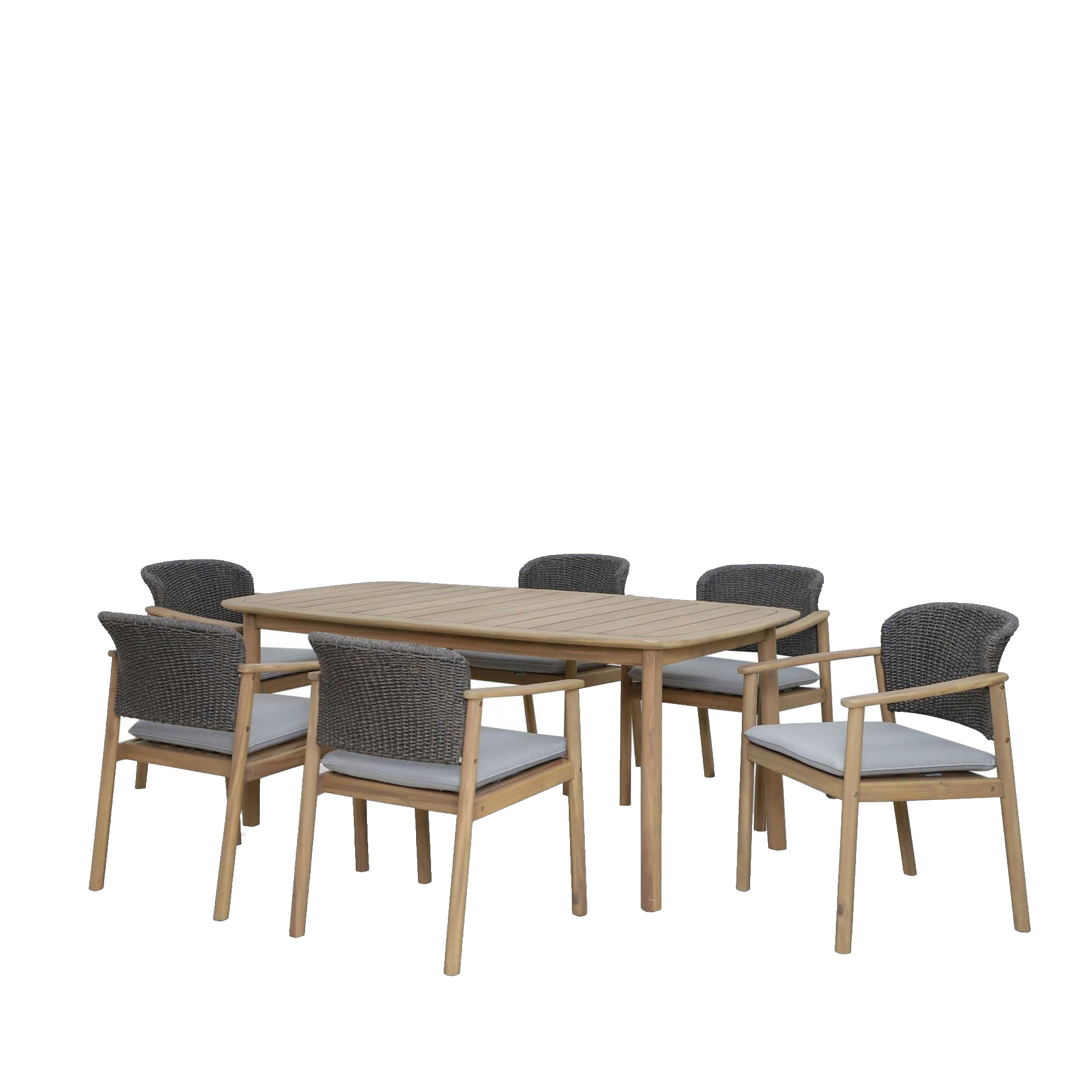 Freeport - это воплощение современного стиля и элегантности для вашего сада. Коллекция, созданная из натуральной акации в сочетании с изысканным веревочным плетением и серыми подушками, привносит уют и роскошь в любое открытое пространство. В состав набора входят большой обеденный стол и шесть удобных кресел с подушкой - идеальный ансамбль для обеда на свежем воздухе. Прочный деревянный каркас обеспечивает надежность и долговечность, а модный дизайн подчеркивает вкус и статус владельца. Freeport - это комфорт, стиль и природная эстетика на вашей веранде.