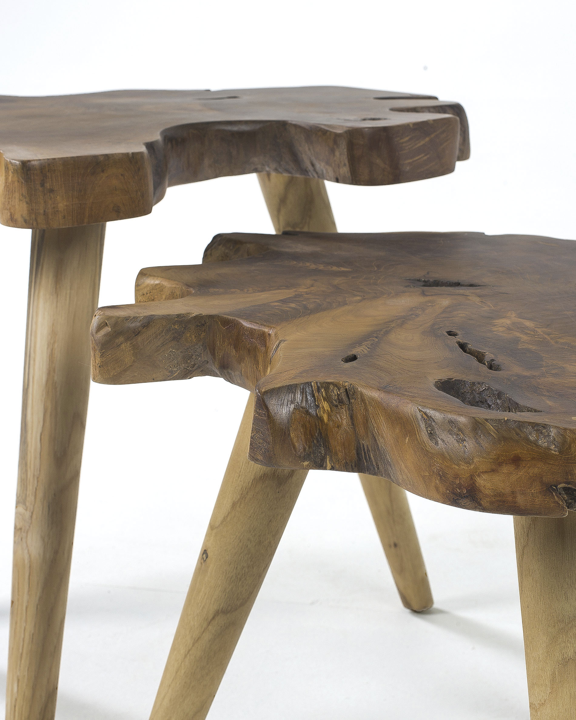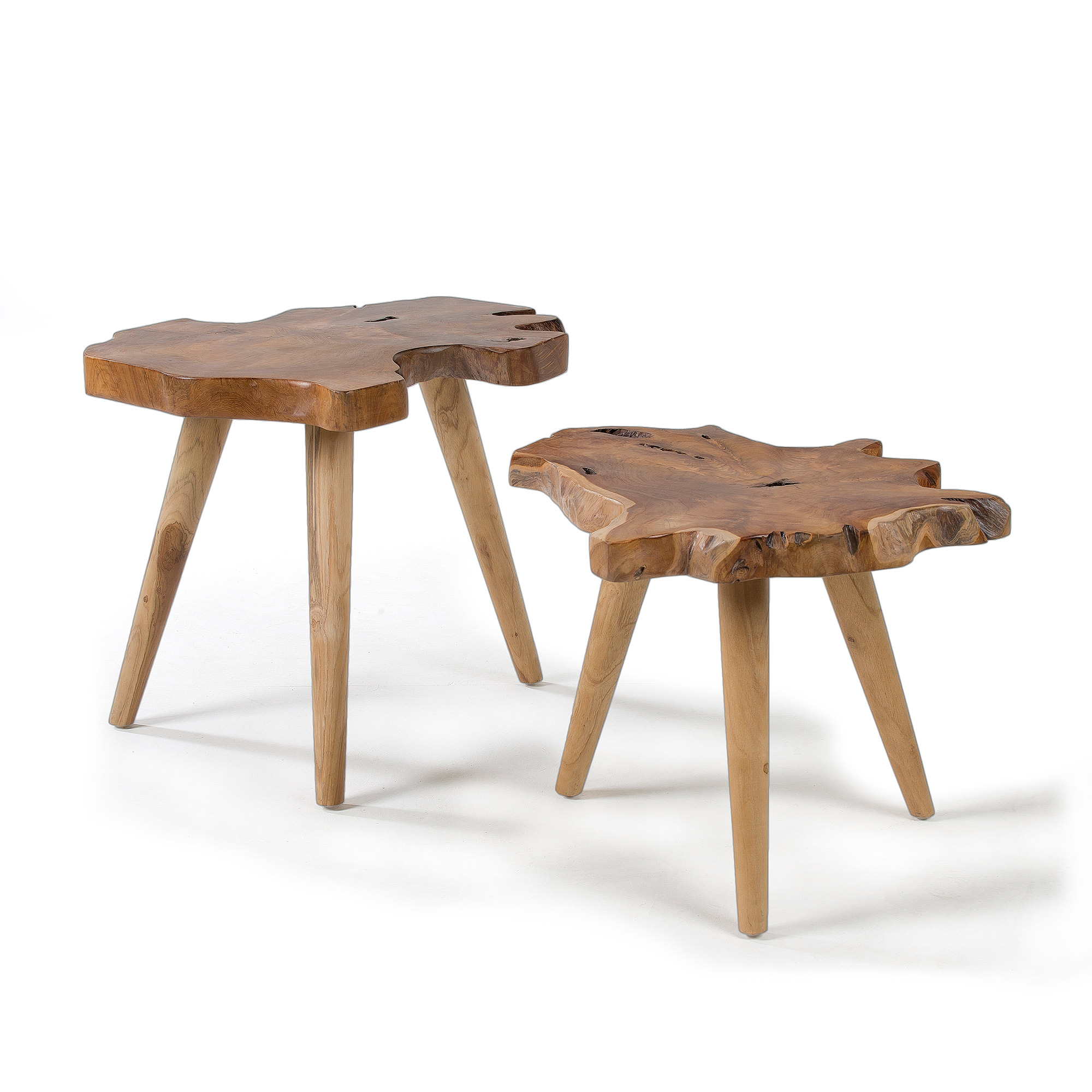 Столики полностью сделаны из тикового дерева. Столешница представляет собой цельный спил толщиной 4,5 см. Он опирается на три конусные ножки, которые равноудалены друг от друга на расстоянии 47 см и 56 см. На каждой есть нейлонова накладка для защиты дерева и напольного покрытия от деформации.