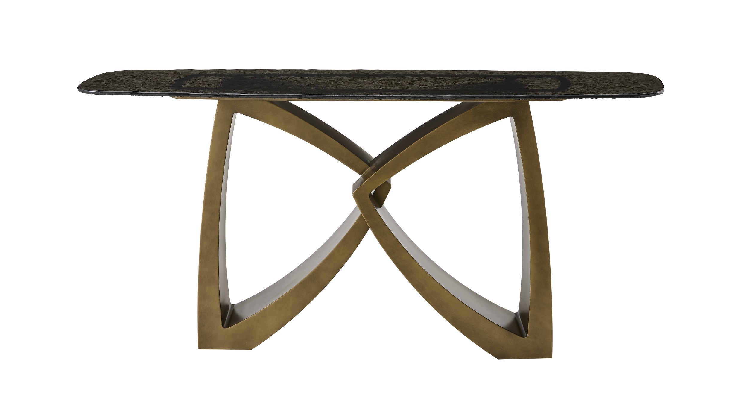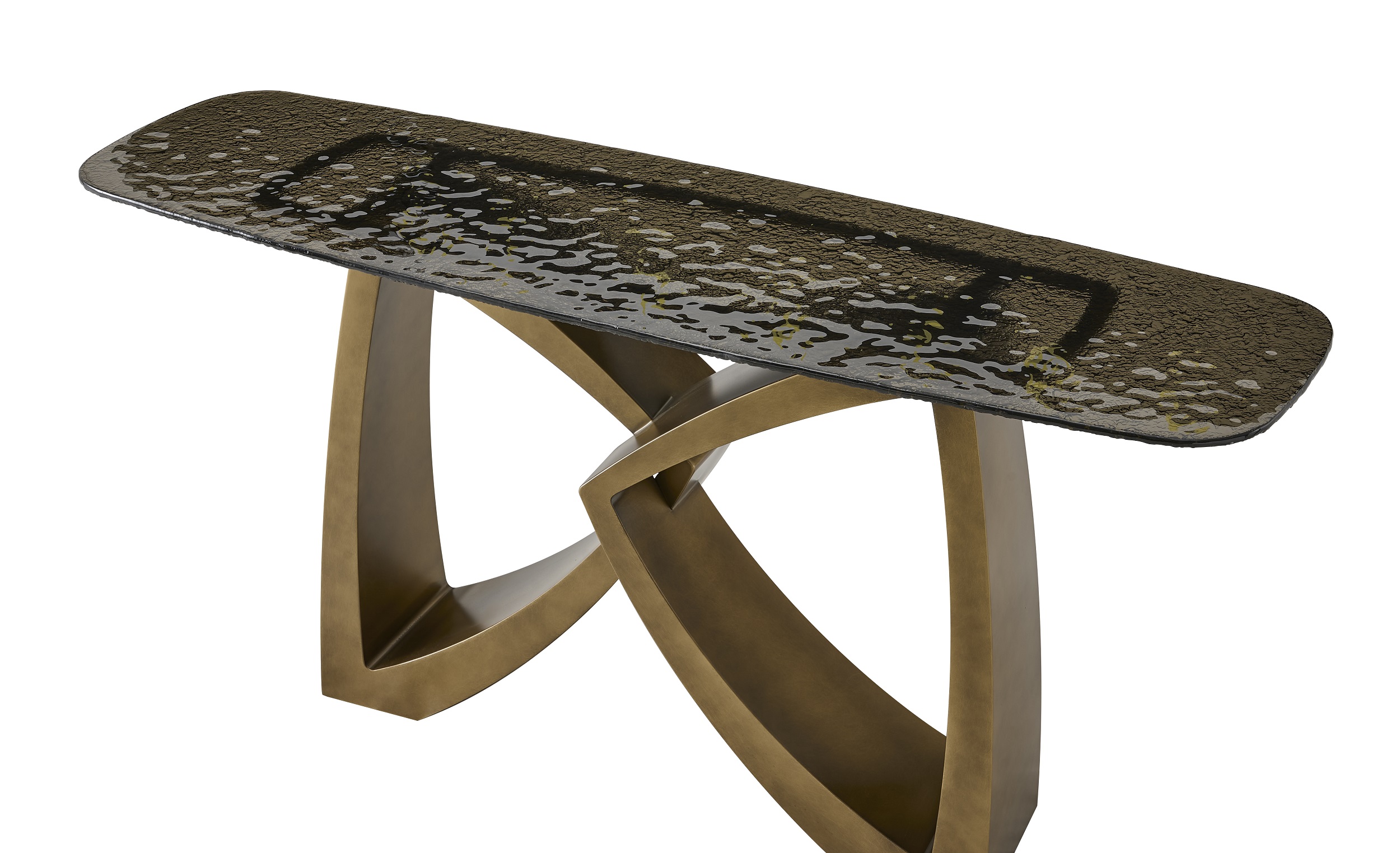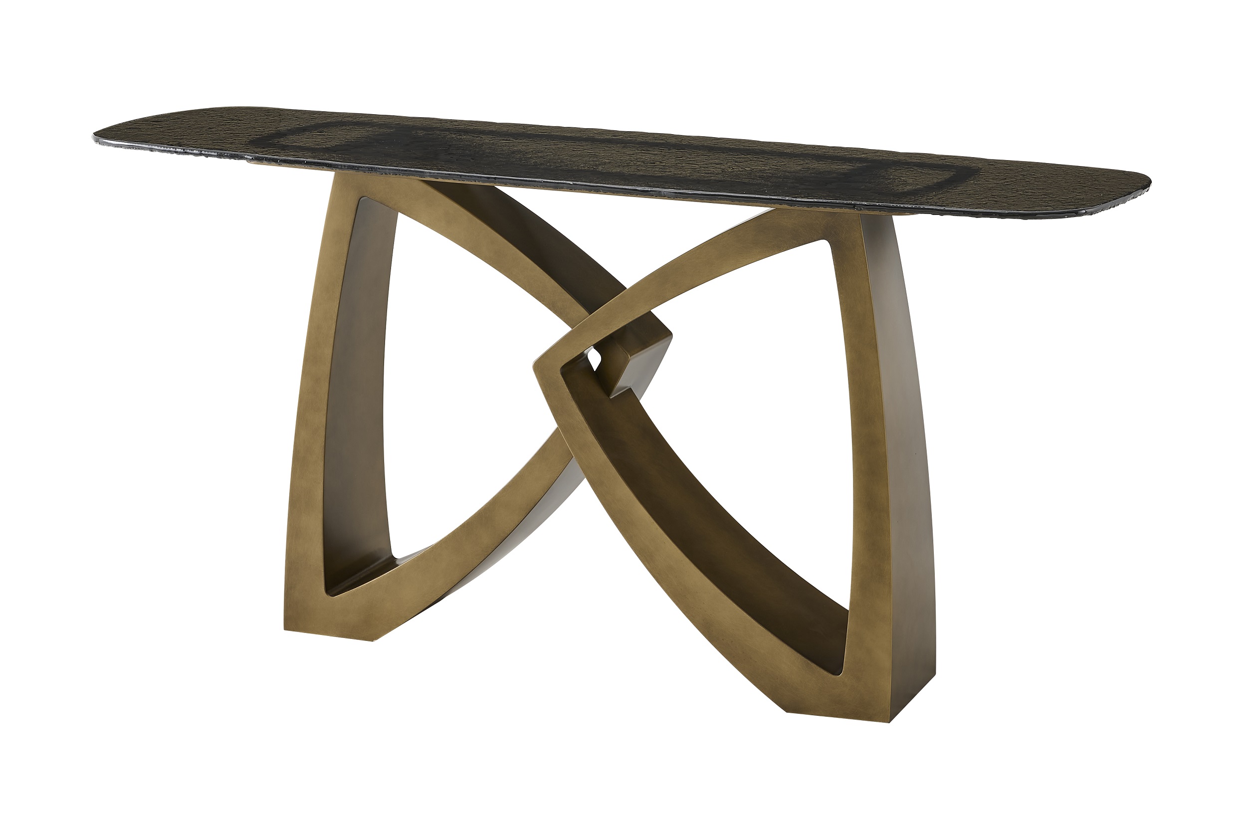 Столешница с закругленными углами выполнена из темно-коричневого стекла толщиной 12 мм. Поверхность стекла рельефная. Основа из металла, цвет - патинированная бронза TK01.