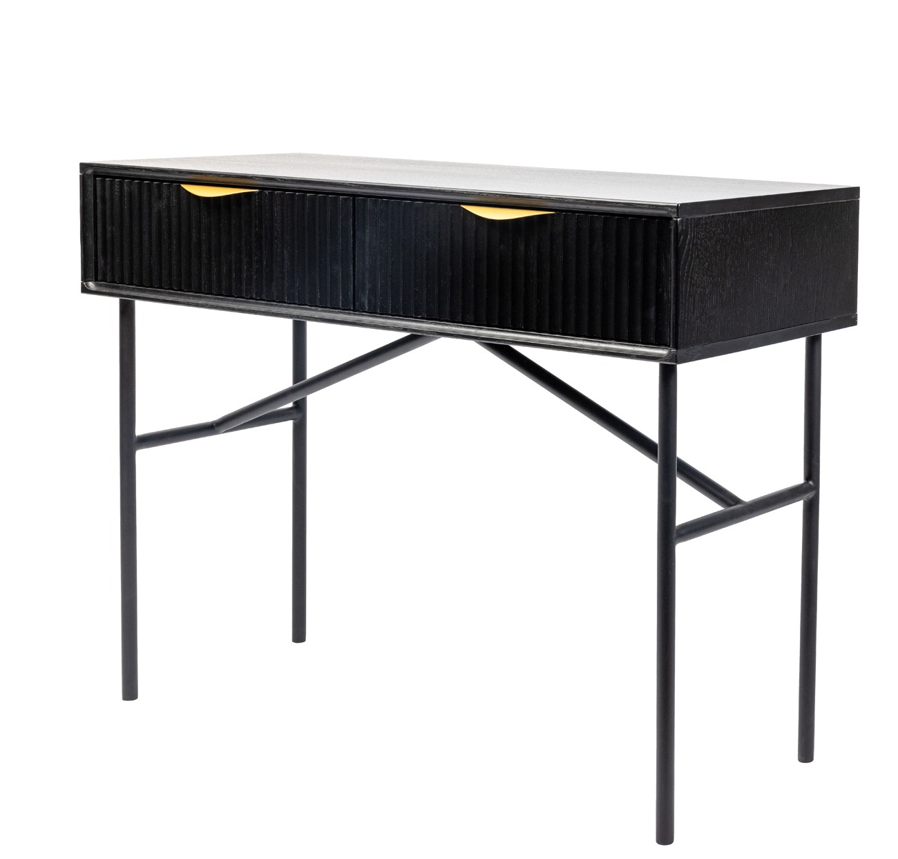 Дизайнерская консоль в стиле арт-деко из коллекции HAINES premium - стильное решение для оформления вашей спальни, гостиной или прихожей. Модель отличается не только презентабельным внешним видом, но и функциональностью. Фигурные лакированные фасады выполнены из высококачественного шпона дуба черного цвета и украшены шлифованными ручками золотого цвета. Два выдвижных ящика оснащены механизмом бесшумного открывания с доводчиком и прекрасно подойдут для хранения различных мелких предметов. Прочные металлические ножки в цвет корпуса придают конструкции легкость и изящество. На нашем сайте представлена полная коллекция HAINES premium - журнальные столы, тумбочка, комод, письменный стол, тв. тумбы и шкаф , чтобы ваш интерьер выглядел элегантно, модно и изысканно.