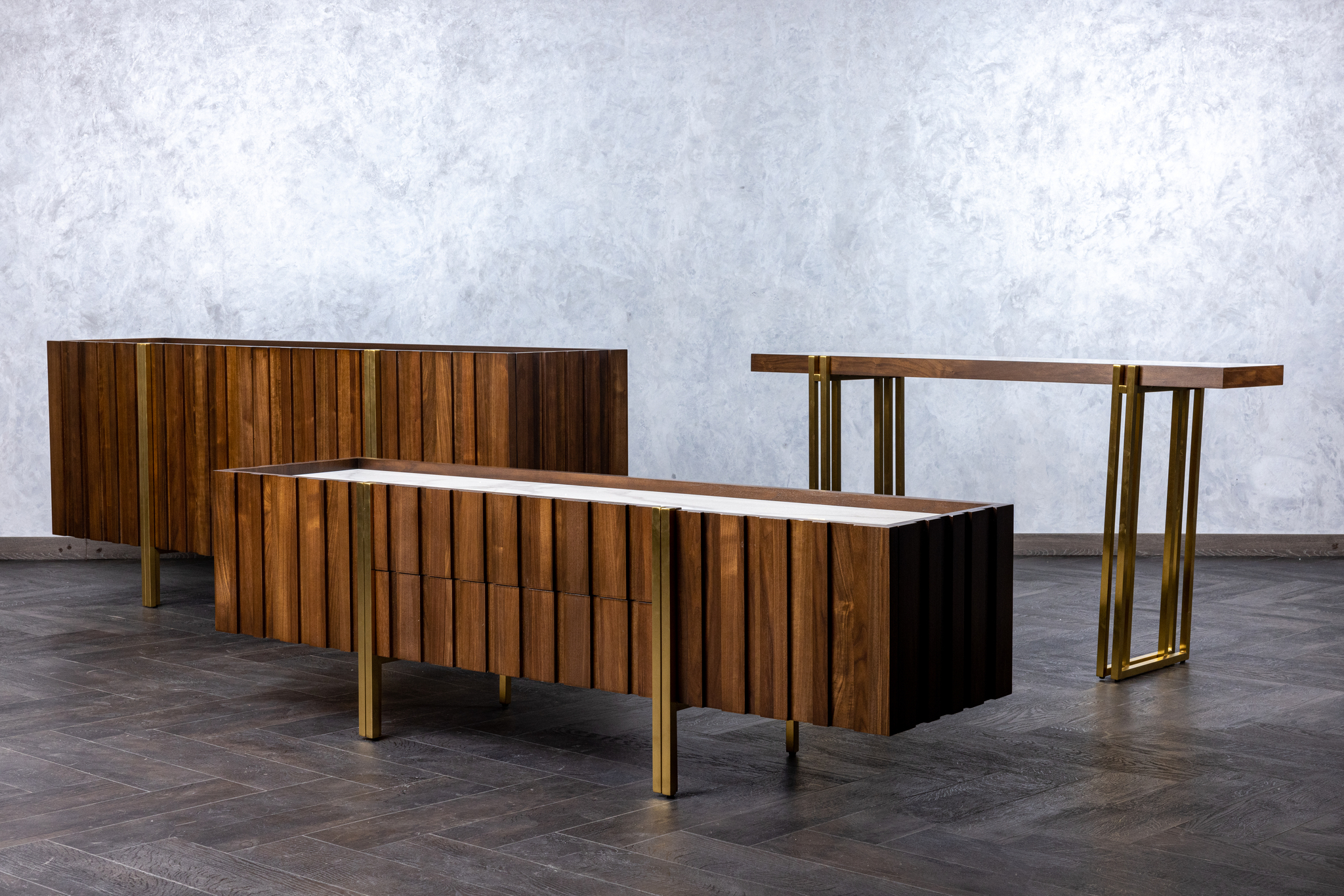В отделке мы используем шпон ценных пород дерева, шлифованную сталь цвета латунь и столешницу под мрамор.