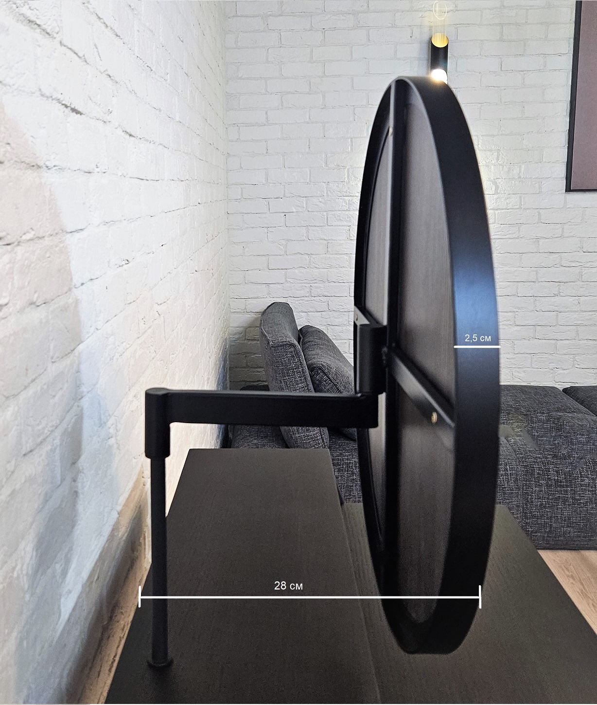Зеркало свободно поворачивается. При необходимости, можно легко снять.