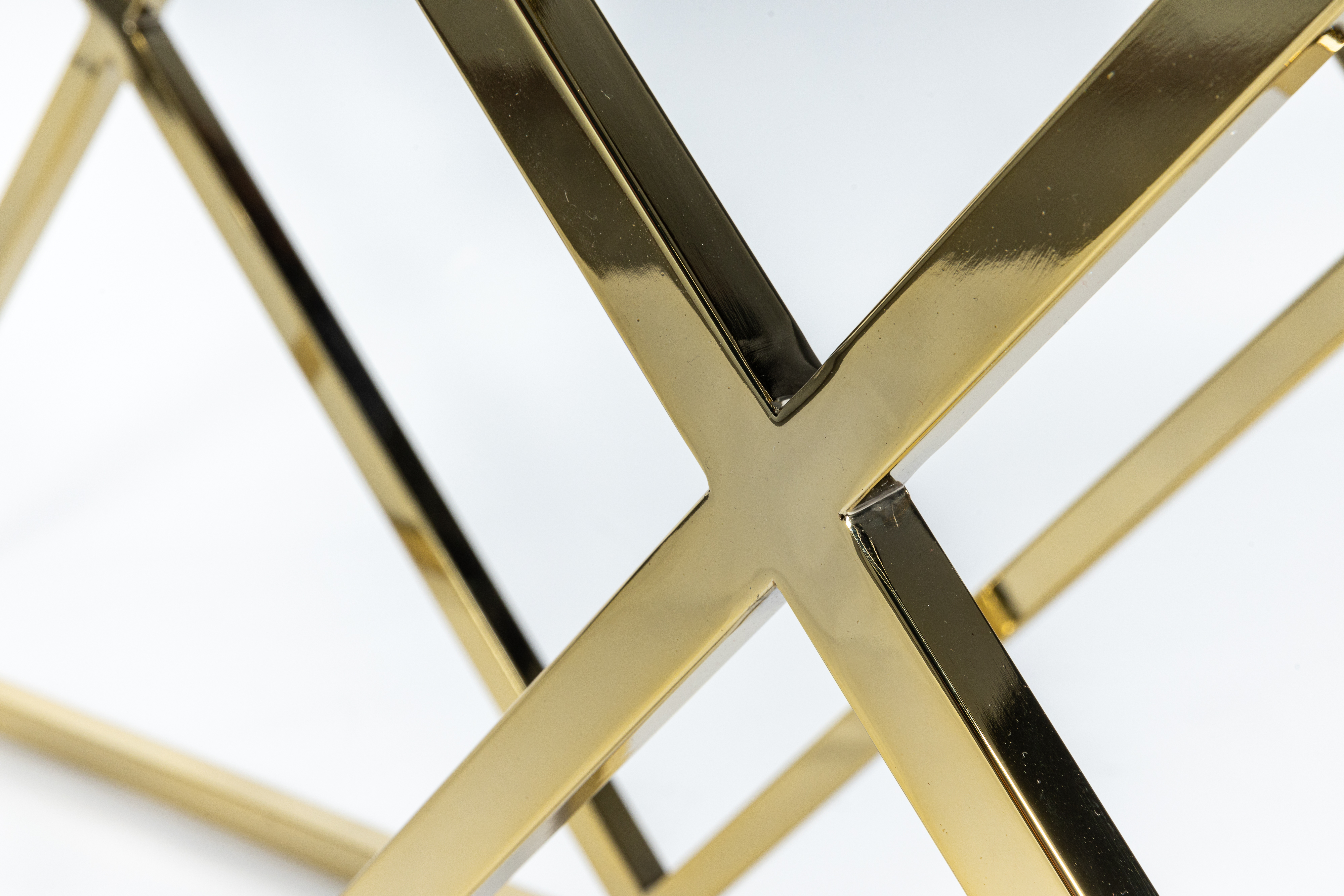 Уникальная консоль Triangles в золотом корпусе. Не только практична, благодаря глубине 35 см и столешнице из искусственного черного мрамора. Своей необычной конструкцией в форме двух треугольников она гармонизирует ваш интерьер и делает его неповторимым.