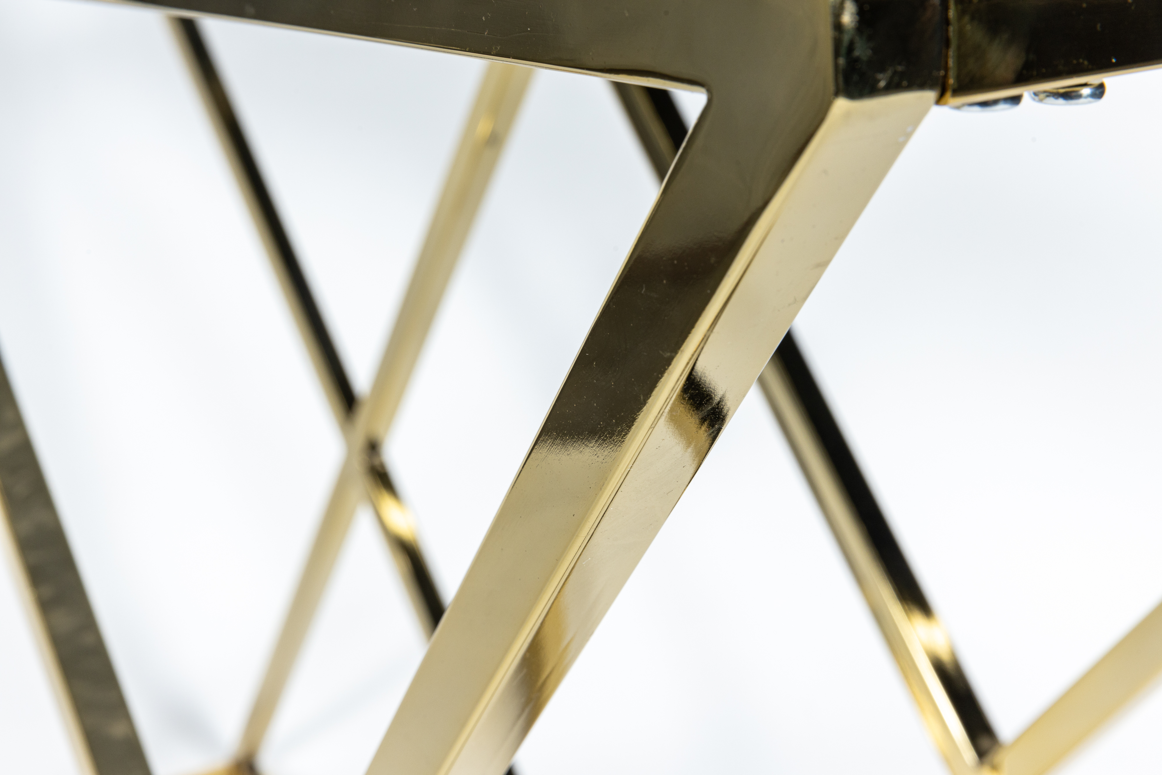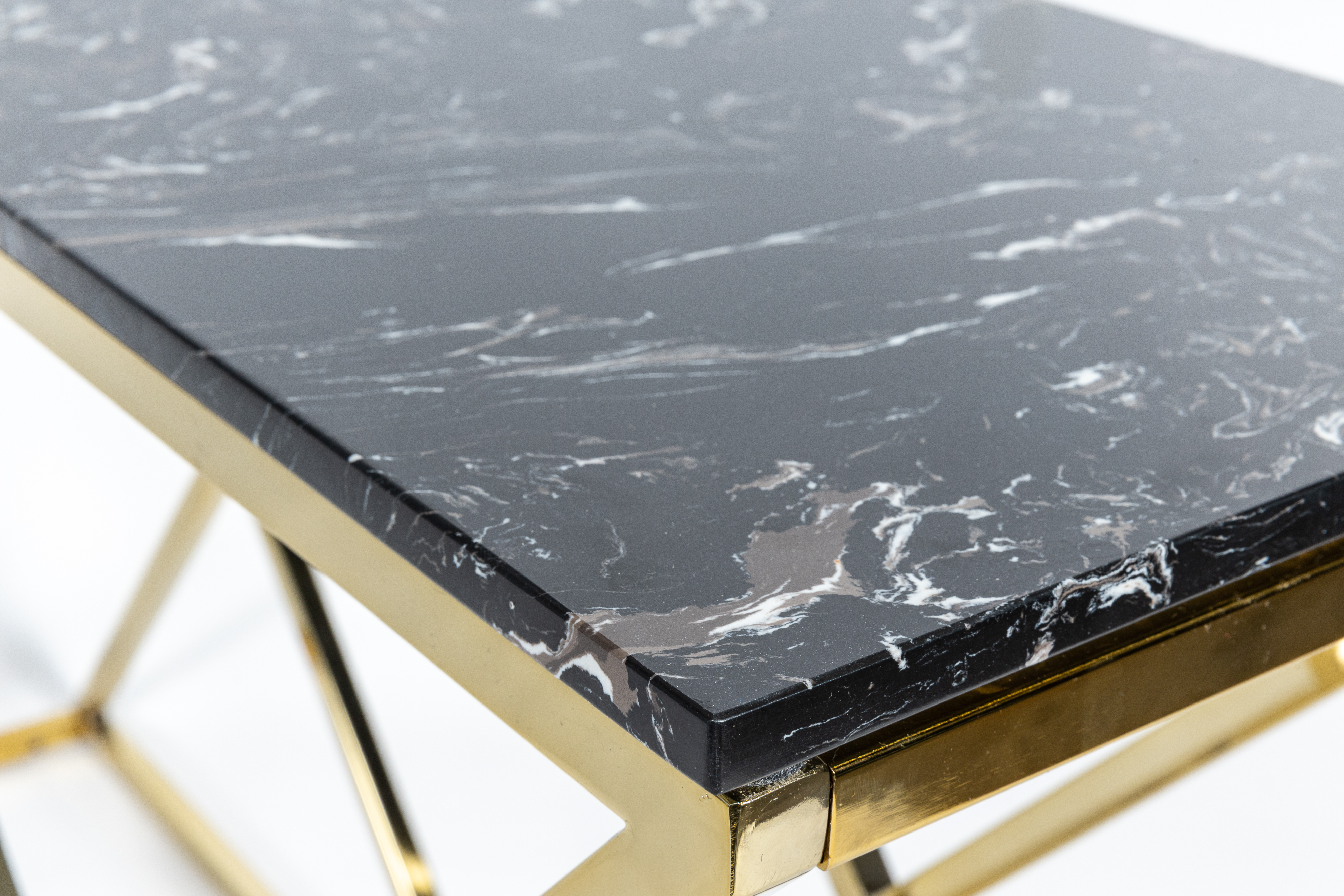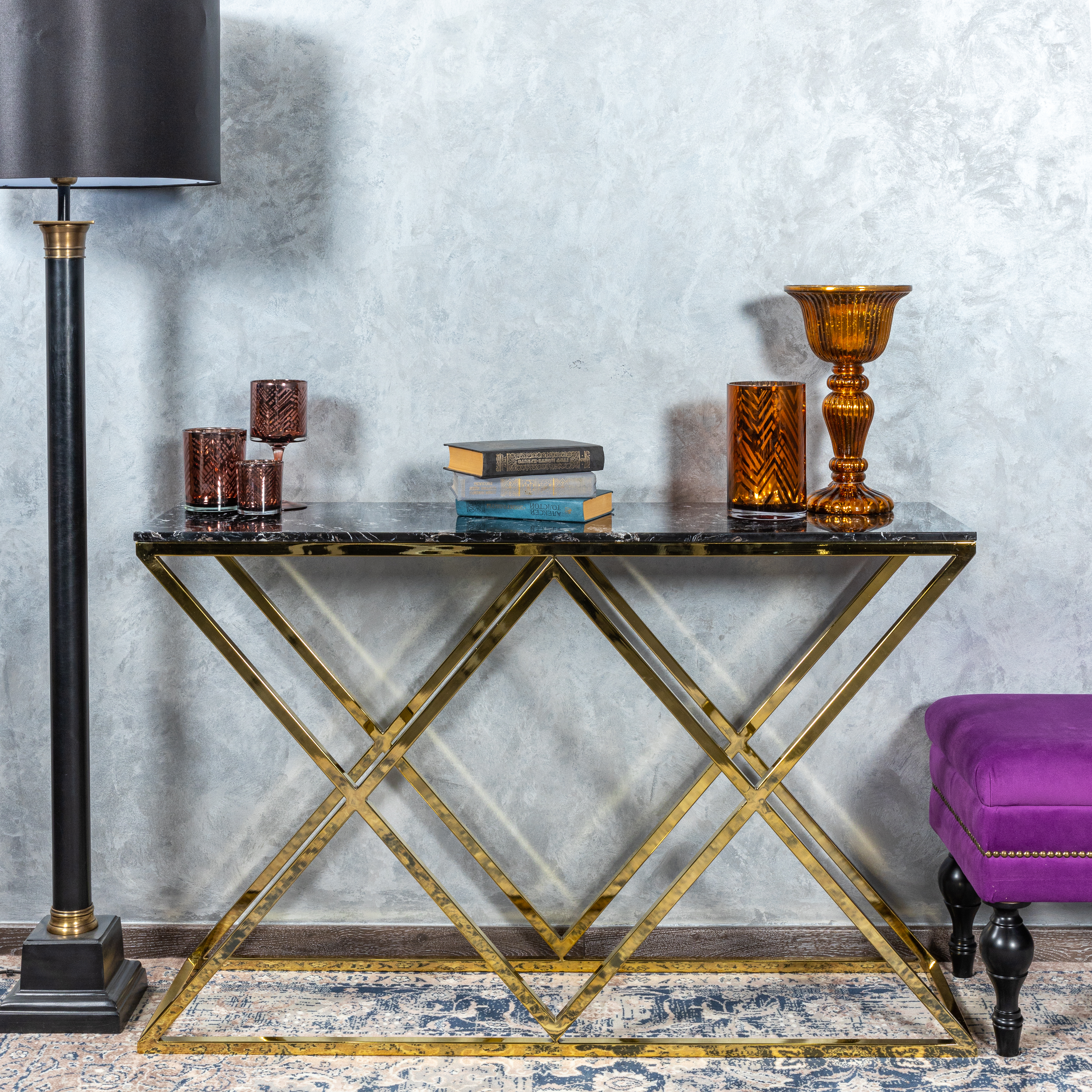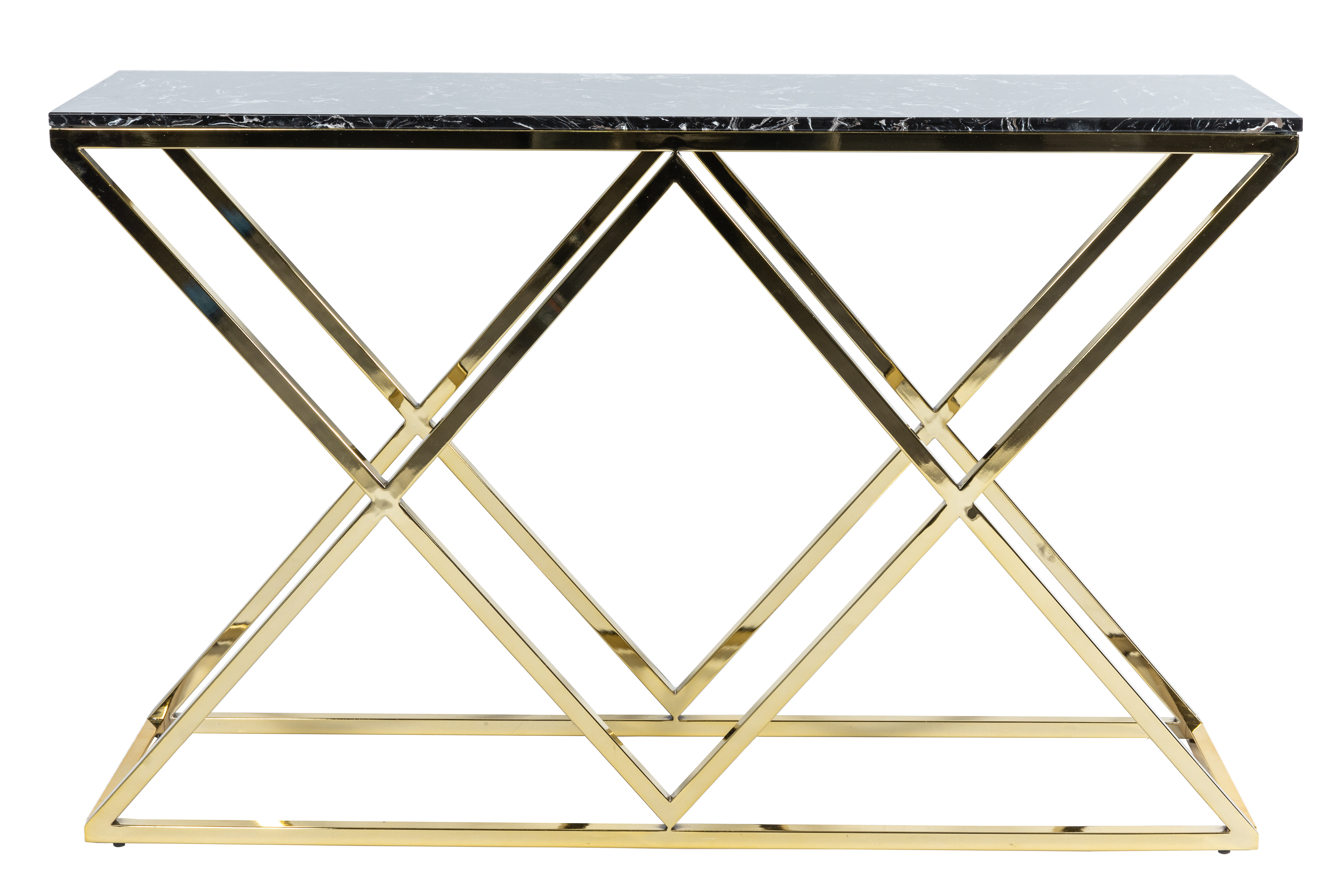 Уникальная консоль Triangles в золотом корпусе. Не только практична, благодаря глубине 35 см и столешнице из искусственного черного мрамора. Своей необычной конструкцией в форме двух треугольников она гармонизирует ваш интерьер и делает его неповторимым.