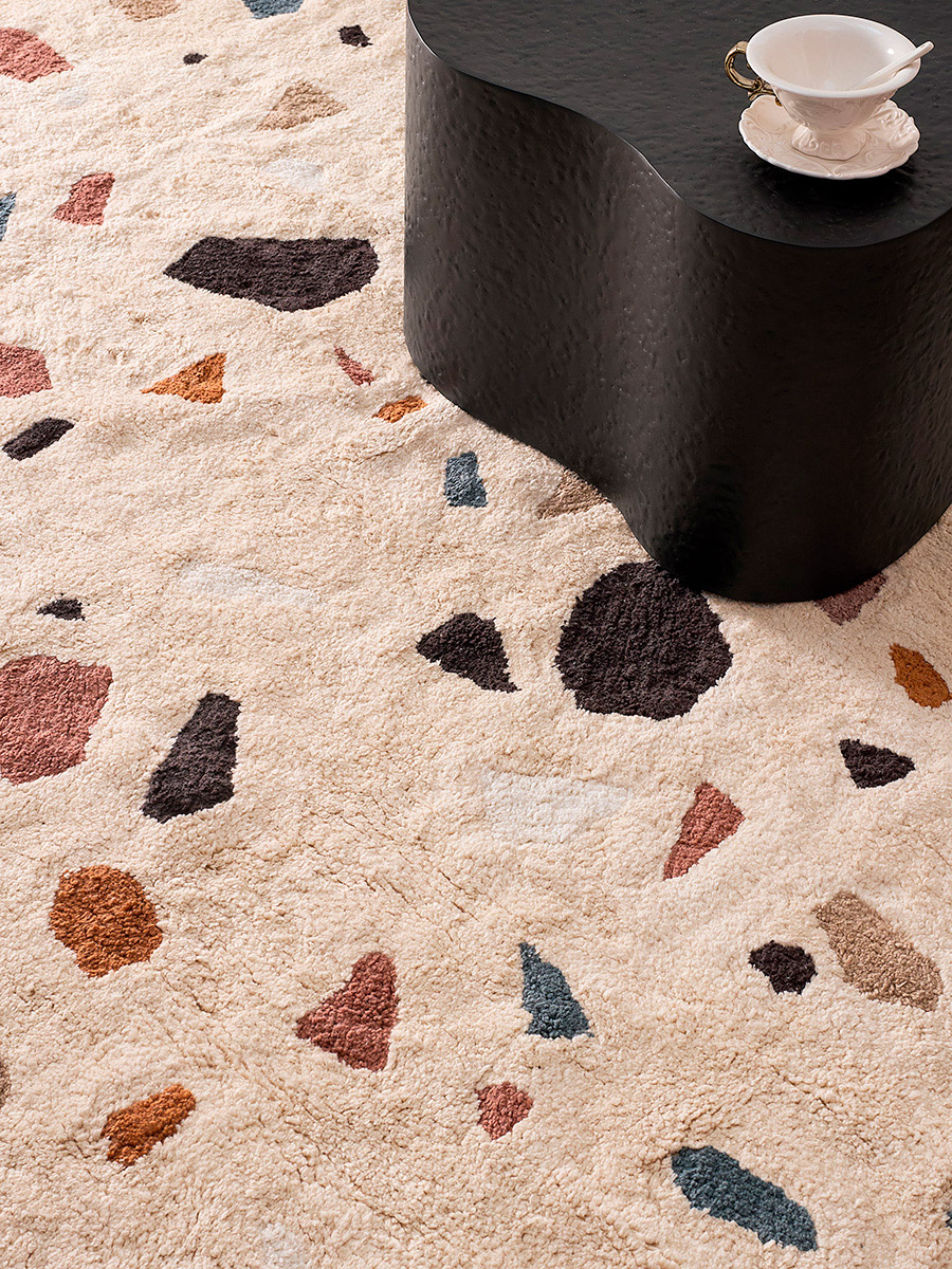 Необычный дизайн ковра Terrazzo Poetry из коллекции Ethnic словно переносит нас в эпоху величественных венецианских дворцов, где каждый элемент рассказывает свою историю. Принт в виде вкраплений мраморной крошки, стеклянных фрагментов и камней создает неповторимую картину, напоминающую старинную мозаику. Этот ковер станет отличным решением для тех, кто с трепетом относится к уюту и комфорту своего дома.