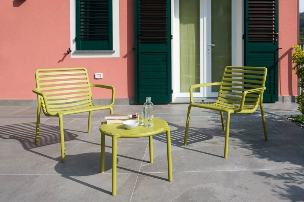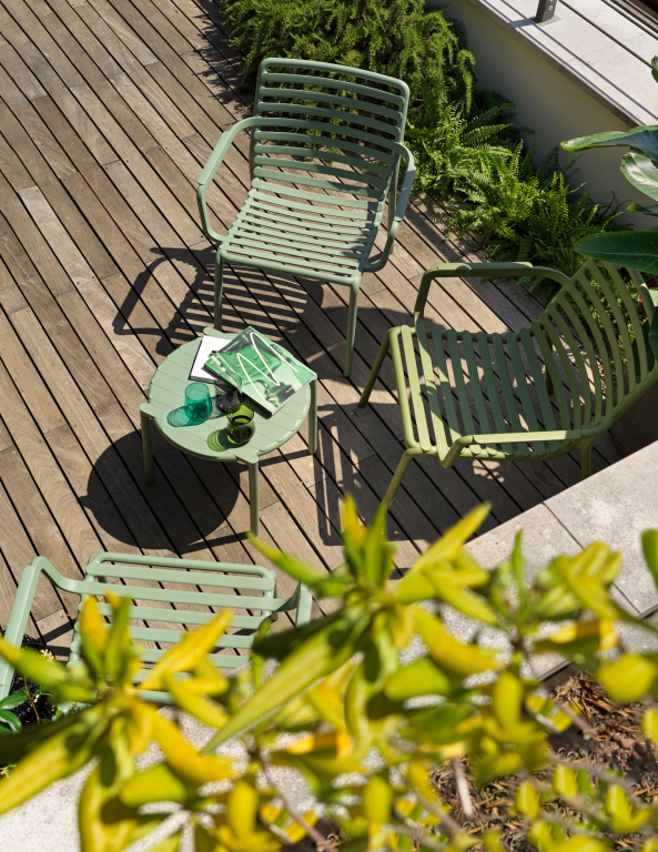 Свежая, легкая и эргономичная, Doga - это новая очаровательная коллекция уличной мебели: Кресла с подлокотниками и без них, кресло для отдыха и моноблочный журнальный столик из стеклопластика (полипропилен и стекловолокно). Вся коллекция была вдохновлена решетчатым дизайном, но Рафаэлло Галиотто, ее дизайнер, придал ей современный оттенок. Плавные линии спинки и сиденья стульев характеризуются игрой заполнений и пустот, отмеченных последовательностью горизонтальных планок.