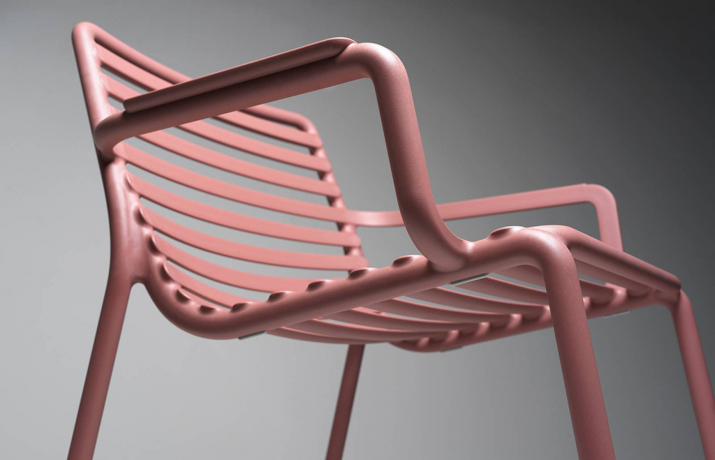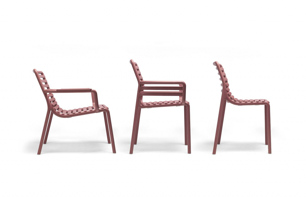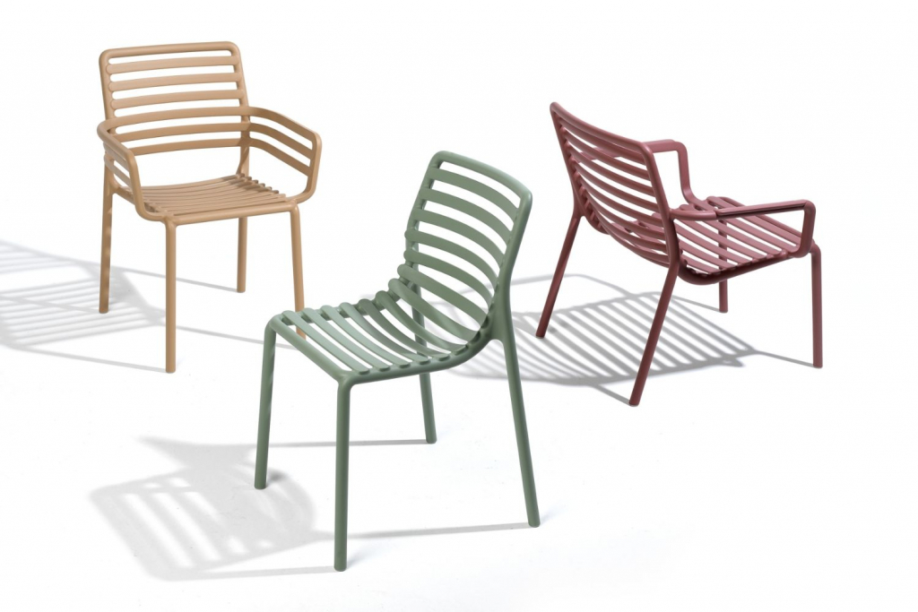 Свежая, легкая и эргономичная, Doga - это новая очаровательная коллекция уличной мебели: Кресла с подлокотниками и без них, кресло для отдыха и моноблочный журнальный столик из стеклопластика (полипропилен и стекловолокно). Вся коллекция была вдохновлена решетчатым дизайном, но Рафаэлло Галиотто, ее дизайнер, придал ей современный оттенок. Плавные линии спинки и сиденья стульев характеризуются игрой заполнений и пустот, отмеченных последовательностью горизонтальных планок.