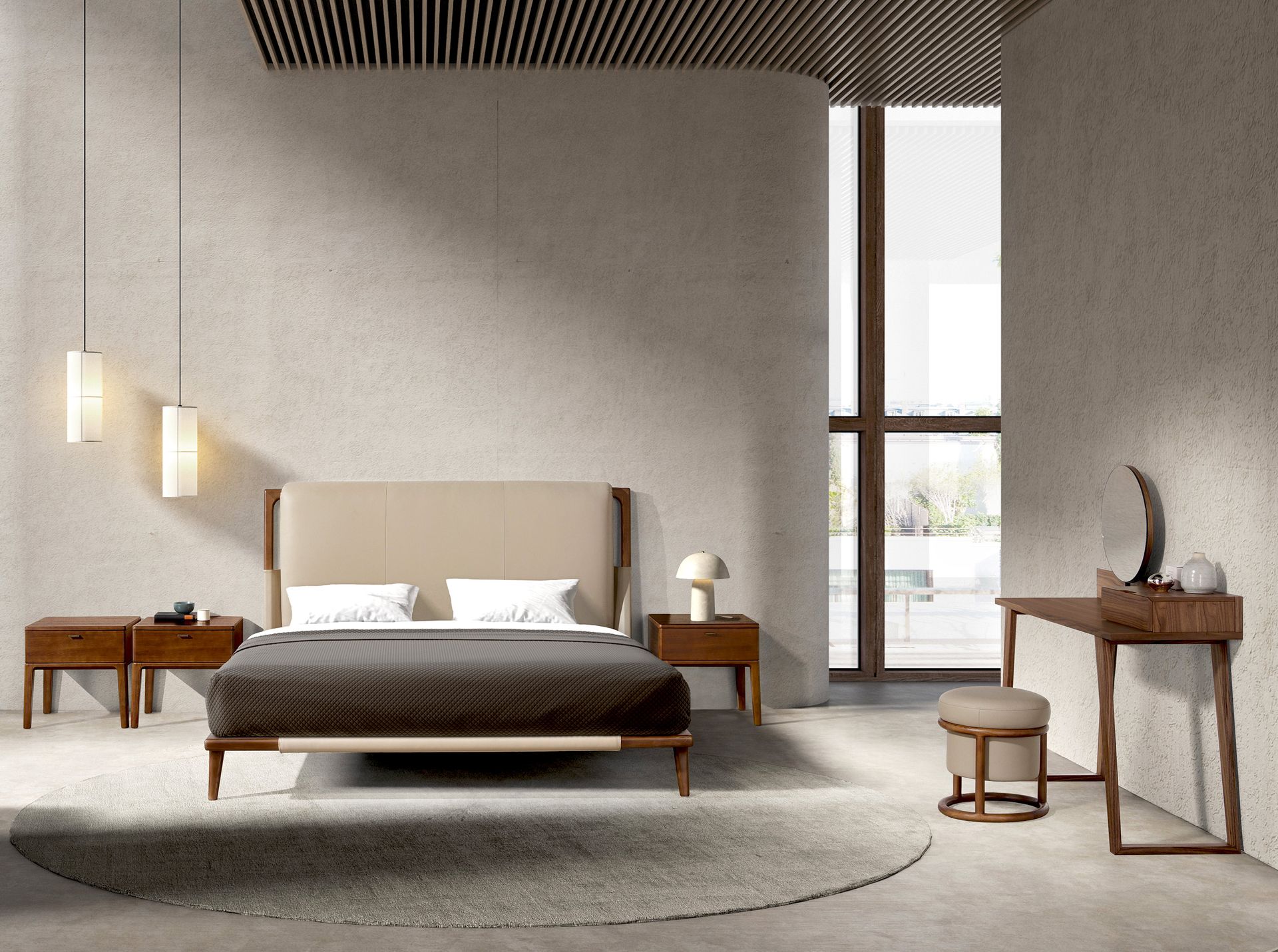 Современная двуспальная кровать с оригинальным изголовьем из искусственной кожи цвета норки и каркасом из дерева цвета тёмного ореха станет незаменимым предметом мебели для вашей спальни, который привнесёт в неё элегантность и уют. Кровать оснащена удобным деревянным основанием, обитым коричневой нескользящей тканью. Подходит для матрасов размером 180 х 200 см.
