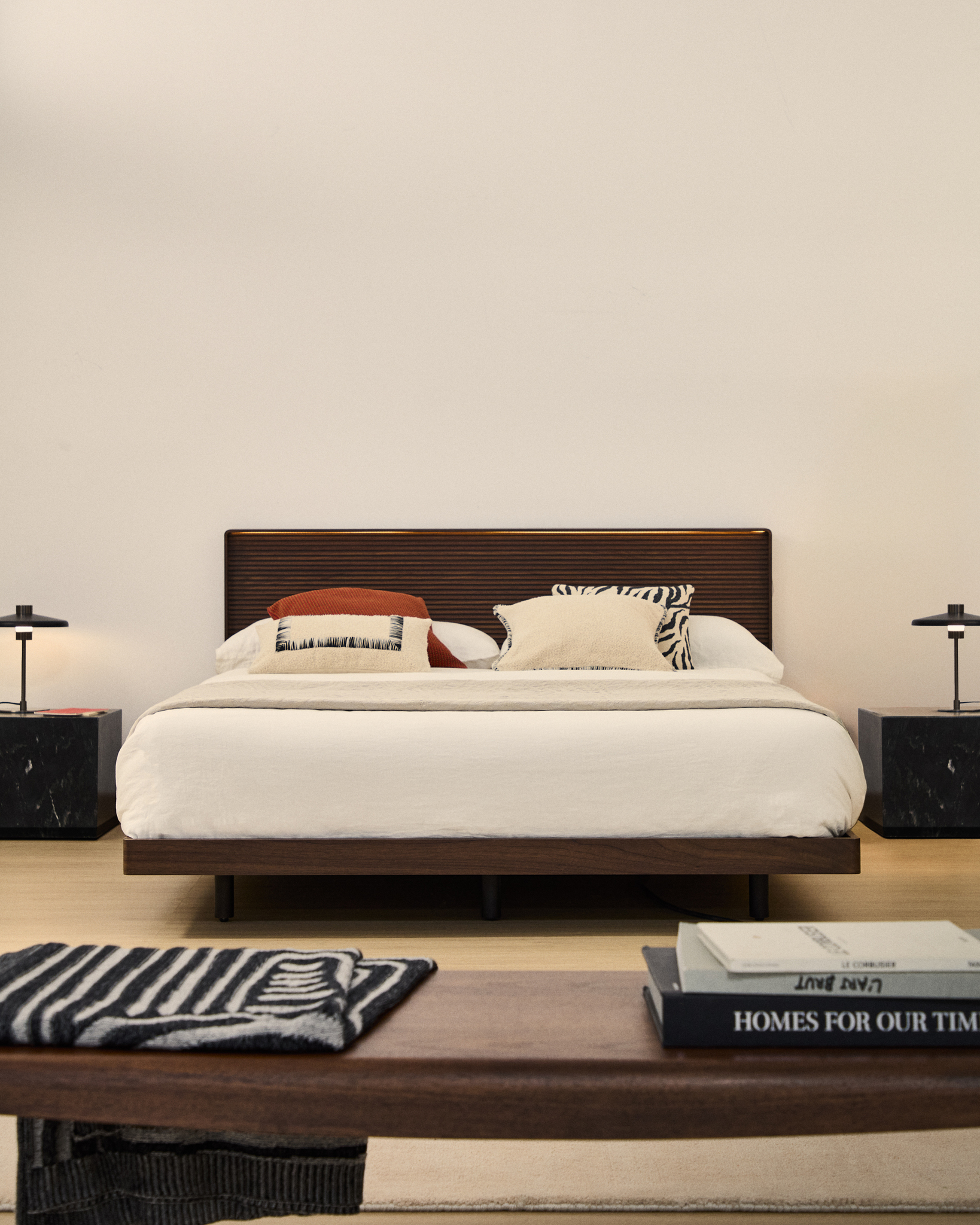 Norlen отдаёт дань уважения дизайну 1950-х годов в современной интерпретации, сочетая минималистичные формы и винтажные детали. Слегка закруглённые углы и деревянное основание создают ностальгическую атмосферу, переосмысленную благодаря чистым линиям и современным пропорциям. Изголовье, выполненное из орехового шпона с изящной горизонтальной линейной фрезеровкой, добавляет индивидуальности и визуальной глубины, а встроенная светодиодная лента в верхней части кровати наполняет комнату тёплым и приятным светом 3000K.