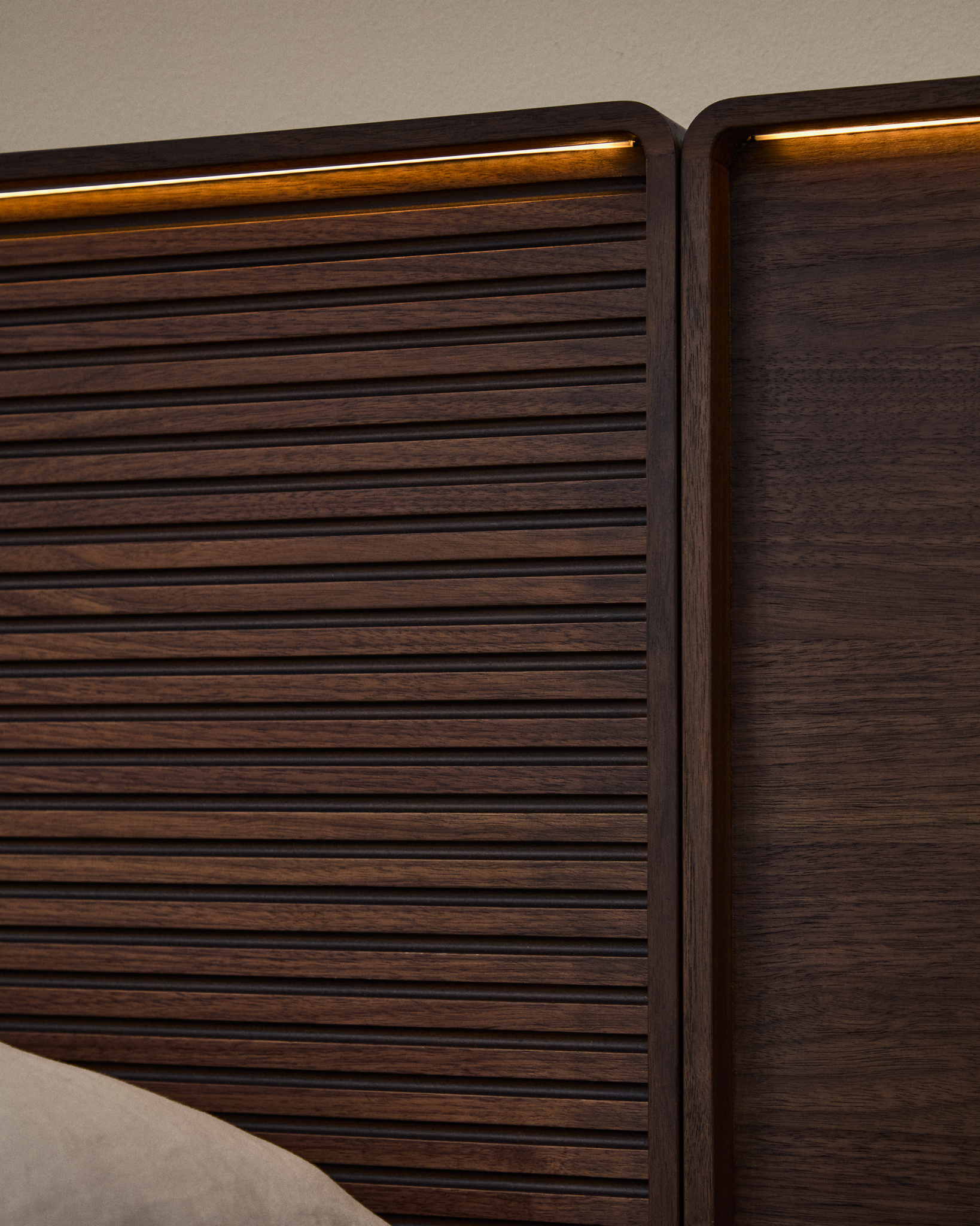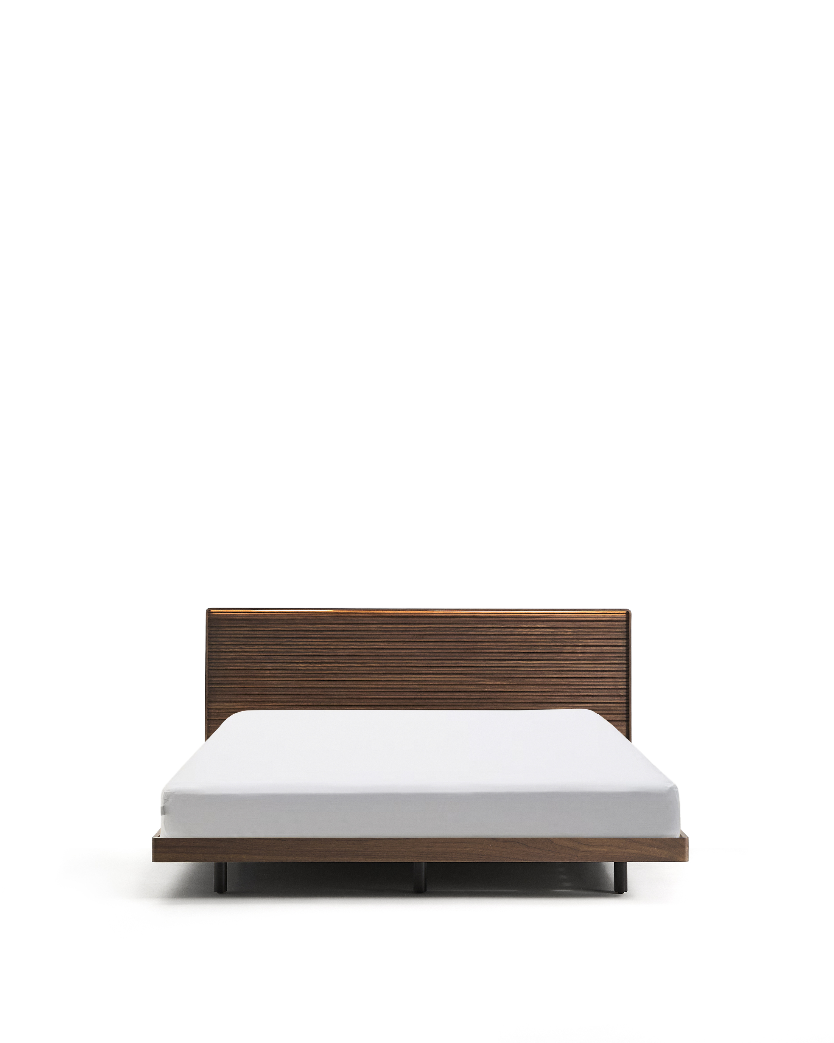 Norlen отдаёт дань уважения дизайну 1950-х годов в современной интерпретации, сочетая минималистичные формы и винтажные детали. Слегка закруглённые углы и деревянное основание создают ностальгическую атмосферу, переосмысленную благодаря чистым линиям и современным пропорциям. Изголовье, выполненное из орехового шпона с изящной горизонтальной линейной фрезеровкой, добавляет индивидуальности и визуальной глубины, а встроенная светодиодная лента в верхней части кровати наполняет комнату тёплым и приятным светом 3000K .