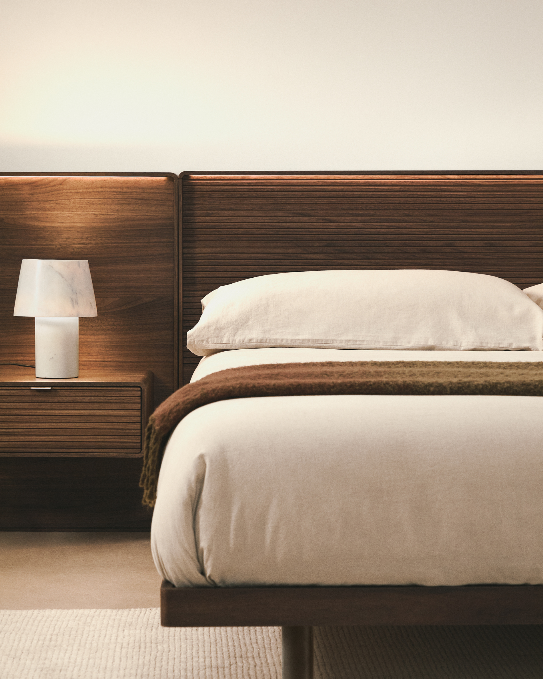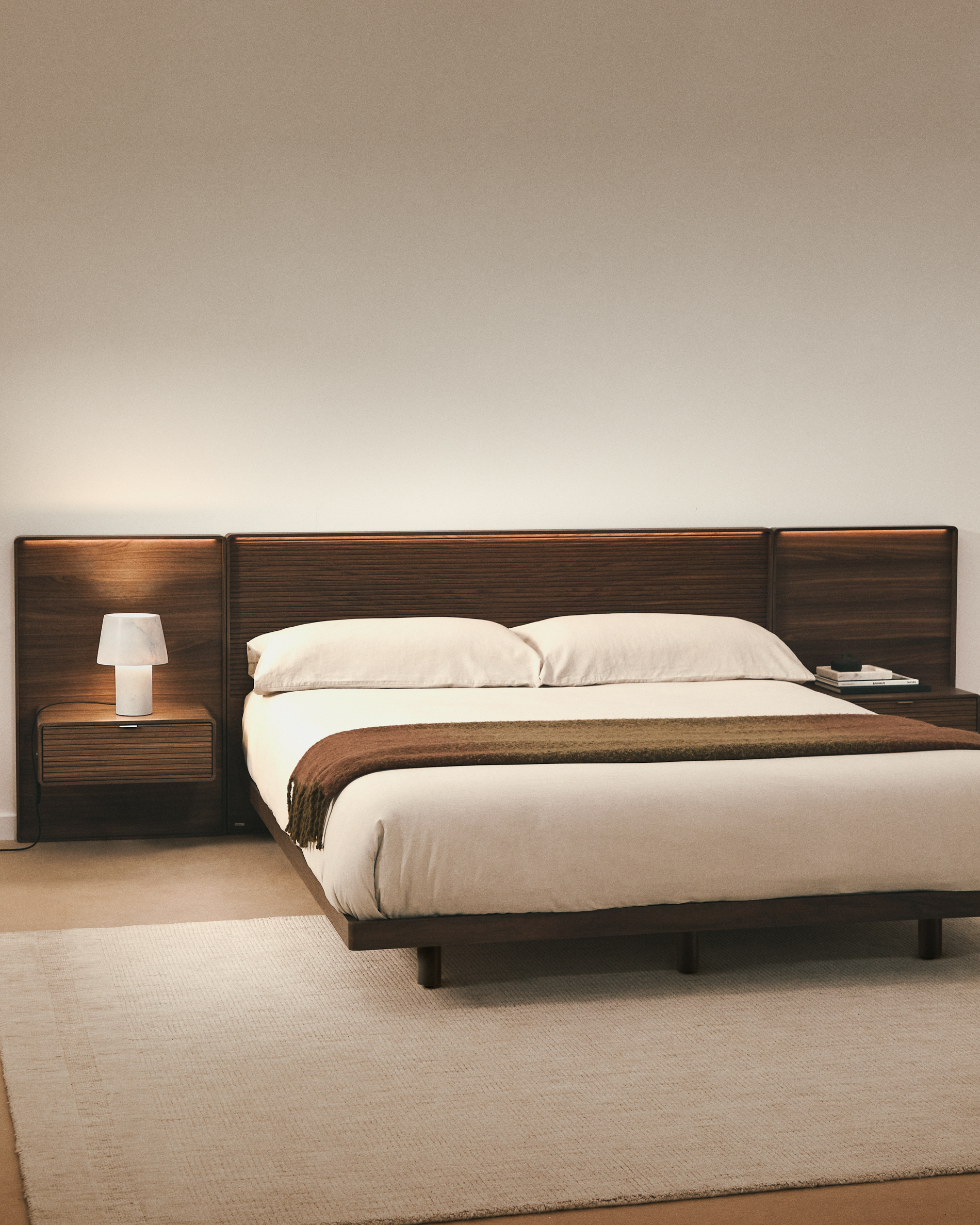Norlen отдаёт дань уважения дизайну 1950-х годов в современной интерпретации, сочетая минималистичные формы и винтажные детали. Слегка закруглённые углы и деревянное основание создают ностальгическую атмосферу, переосмысленную благодаря чистым линиям и современным пропорциям. Изголовье, выполненное из орехового шпона с изящной горизонтальной линейной фрезеровкой, добавляет индивидуальности и визуальной глубины, а встроенная светодиодная лента в верхней части кровати наполняет комнату тёплым и приятным светом 3000K с лёгким желтоватым оттенком.