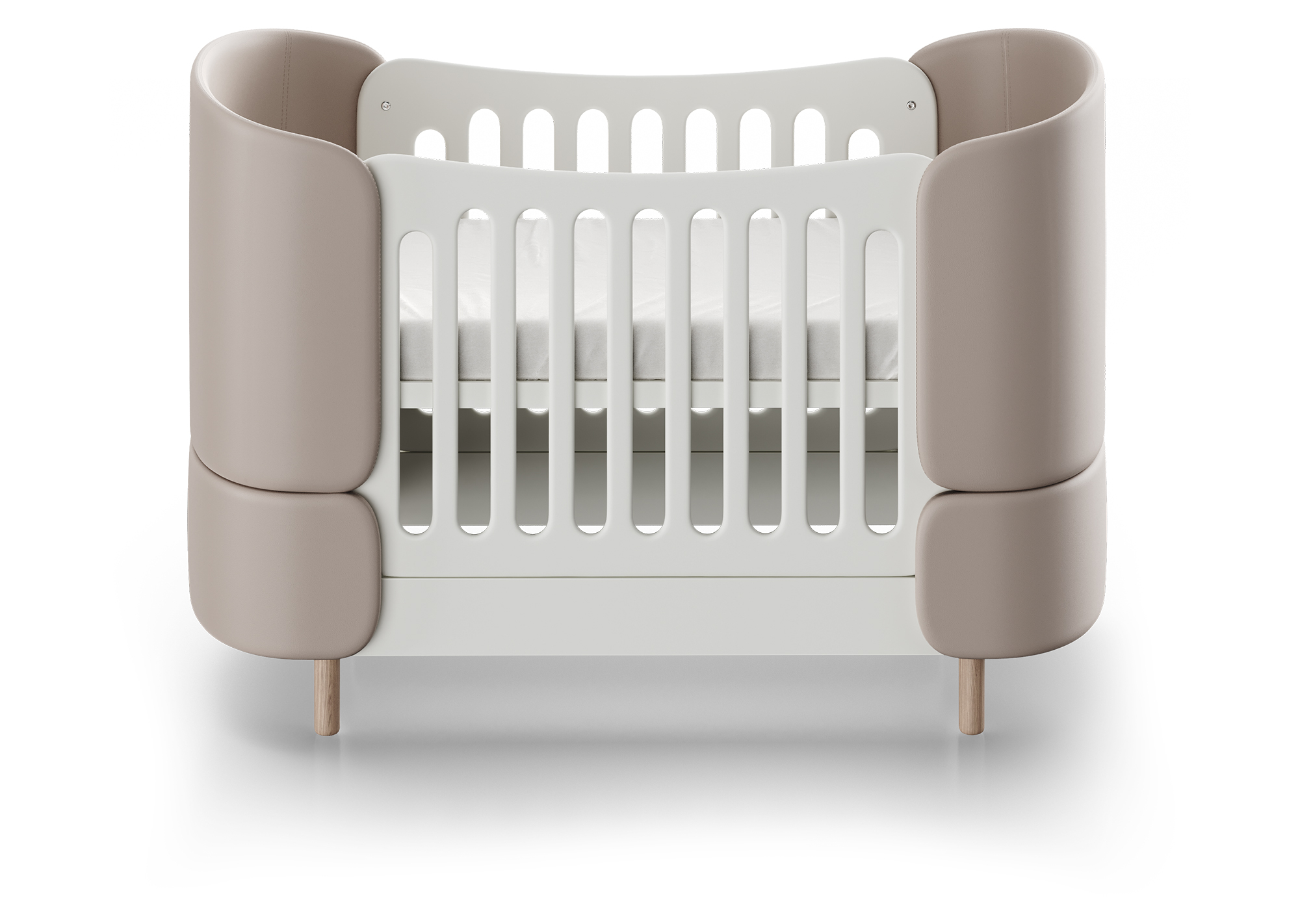 Кроватка-трансформер KIDI Soft с мягкими спинками из экокожи имеет увеличенный размер спального места, что позволяет использовать кроватку даже в базовой комплектации до 4 лет